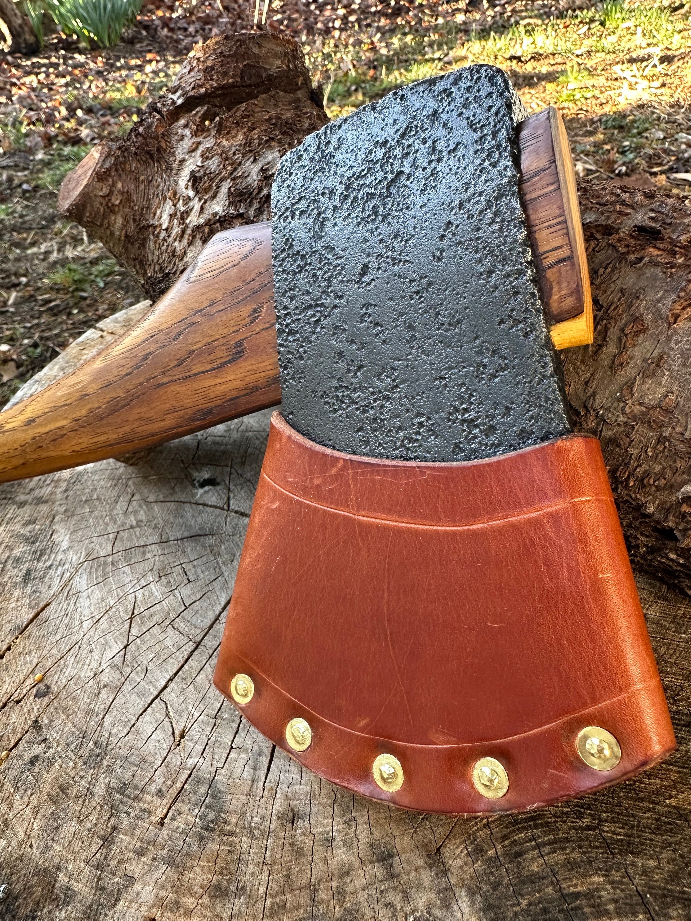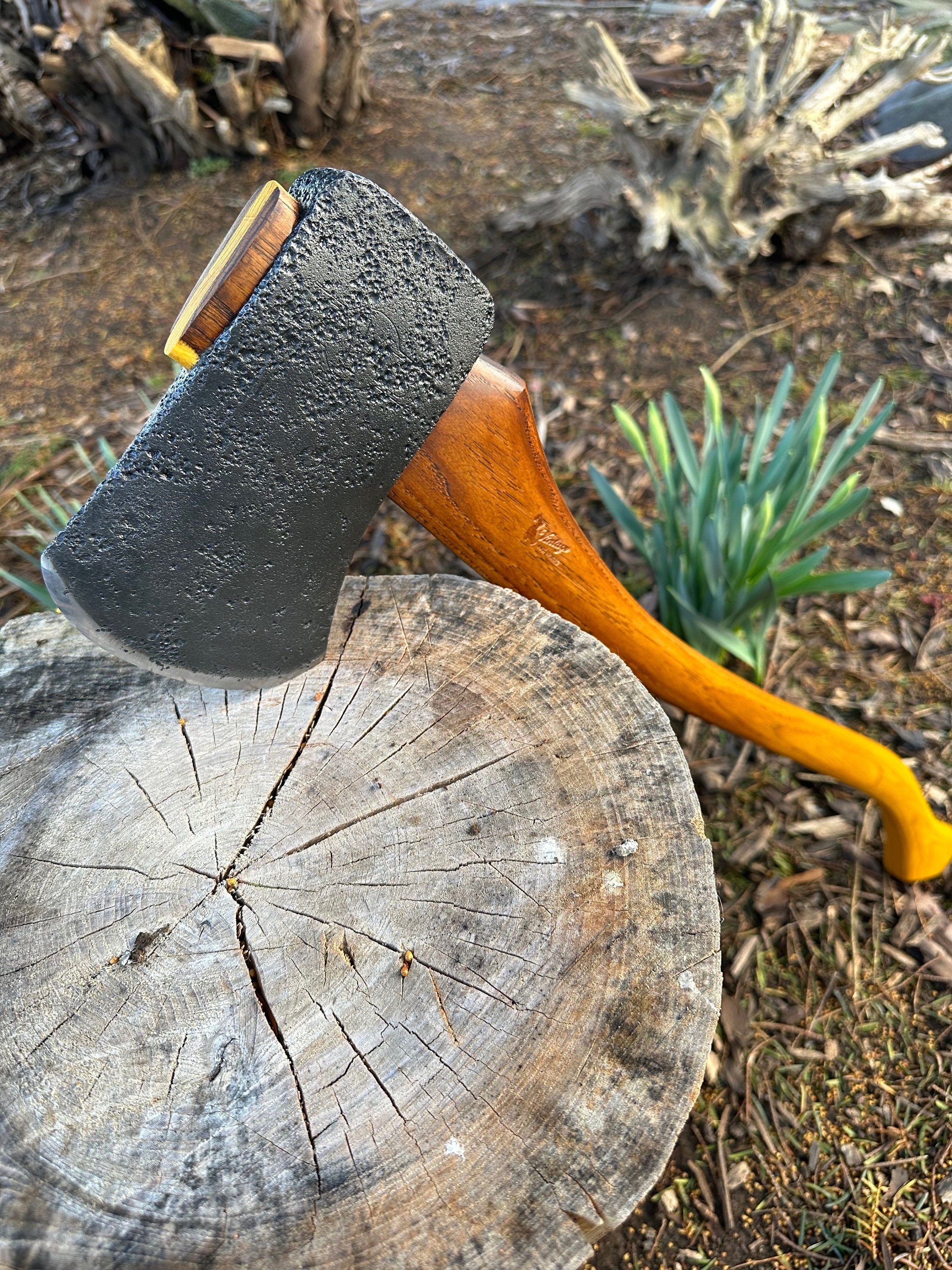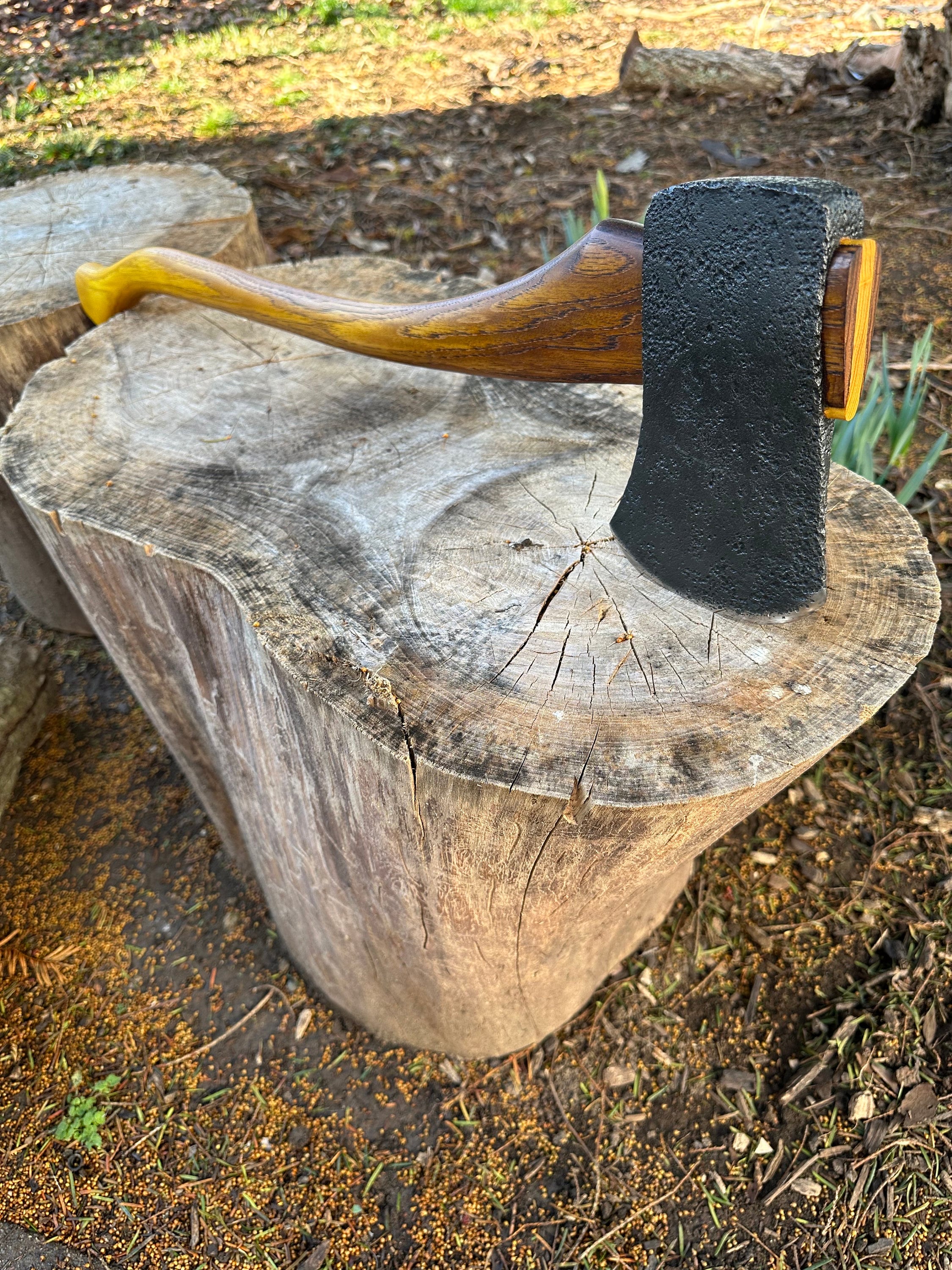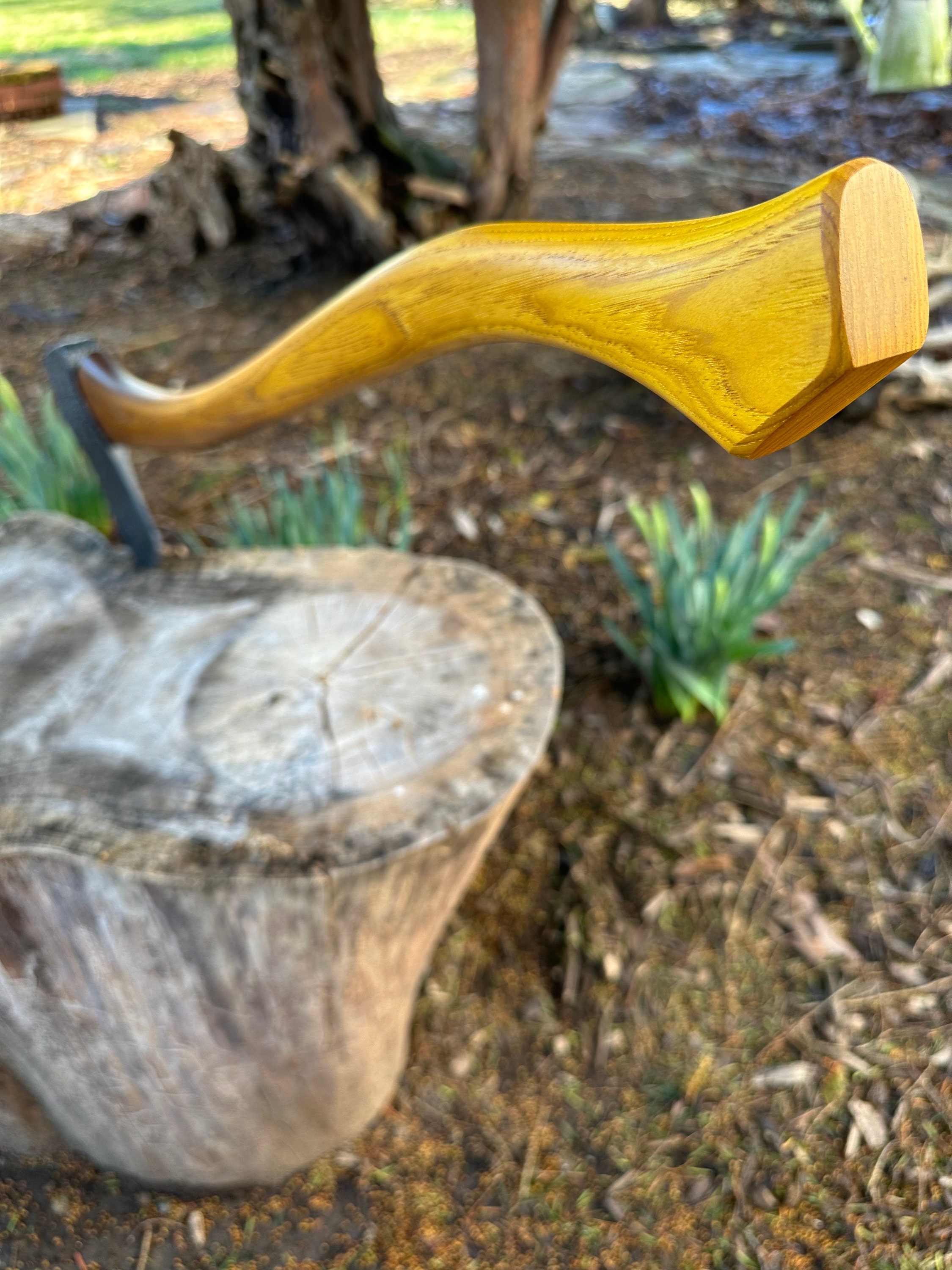 New 28” French curve handle has been dyed tri-burst gradient from lemon yellow to a medium brown. The handle has been HAND-SHAPED, hand sanded, soaked in Odie’s Oil and hand-rubbed for a clean, smooth look and feel. Clean seal around top and bottom of eye and hung with a hardwood wedge – handle sticks out from head approximately 3/16”.