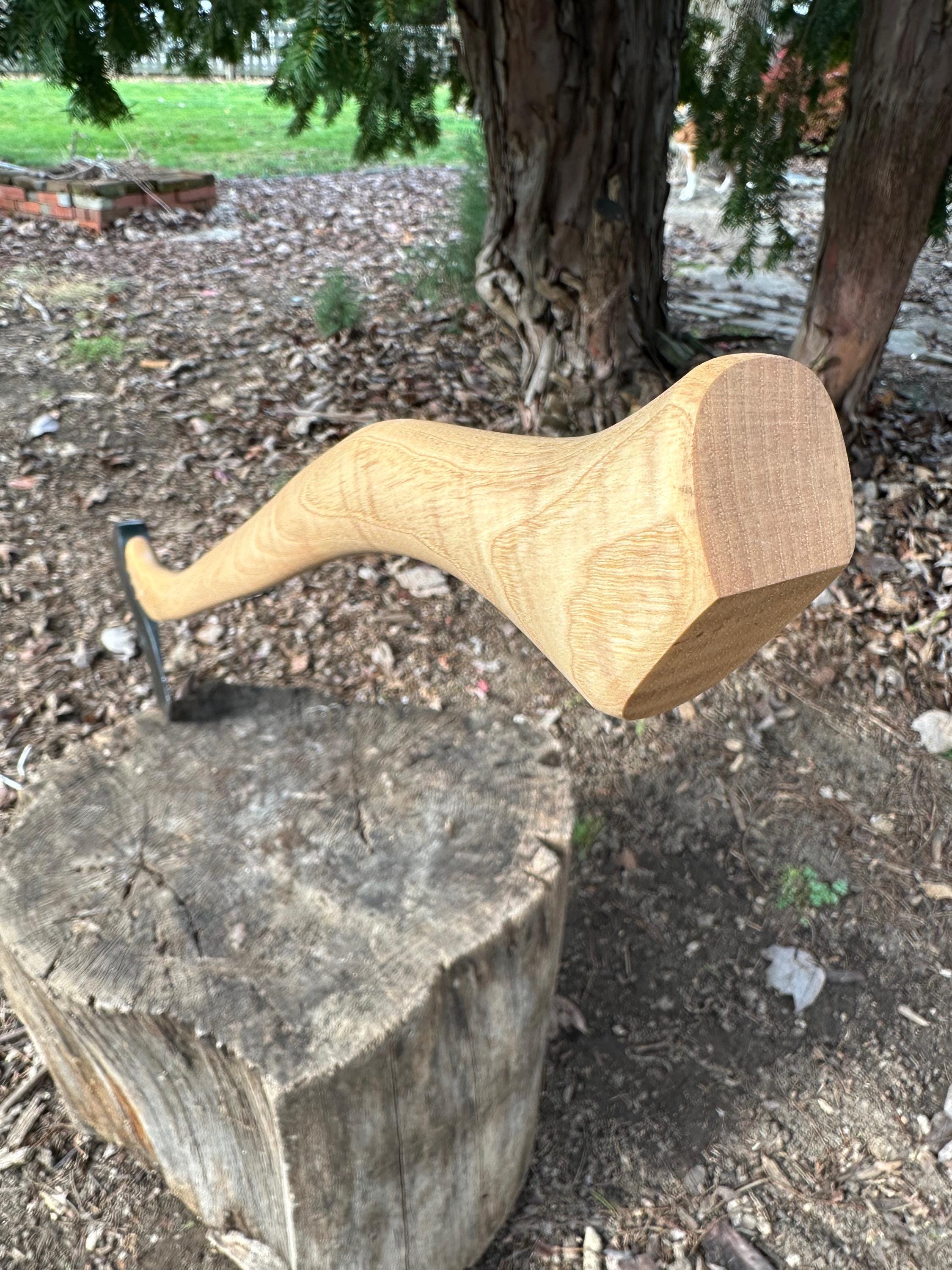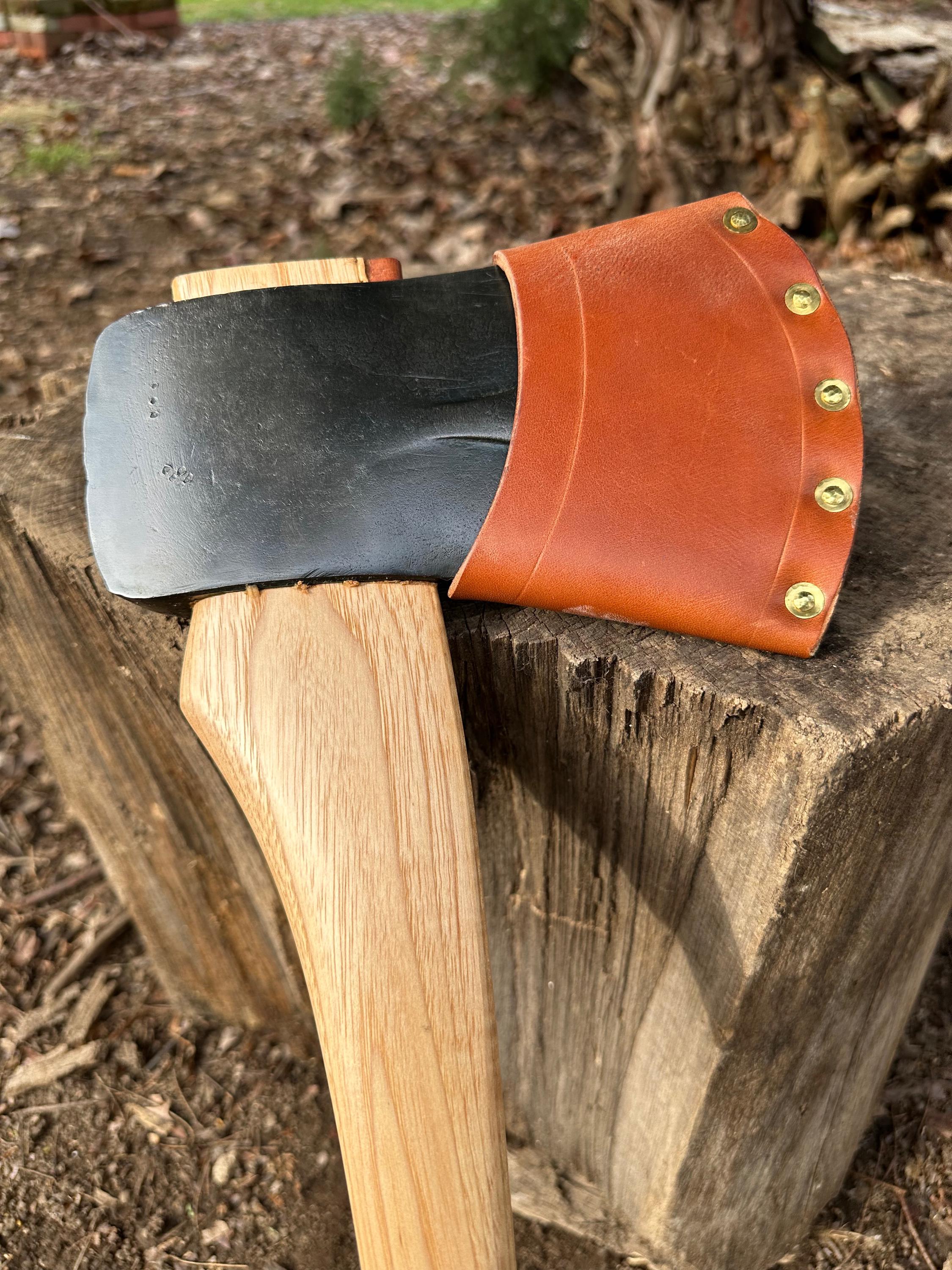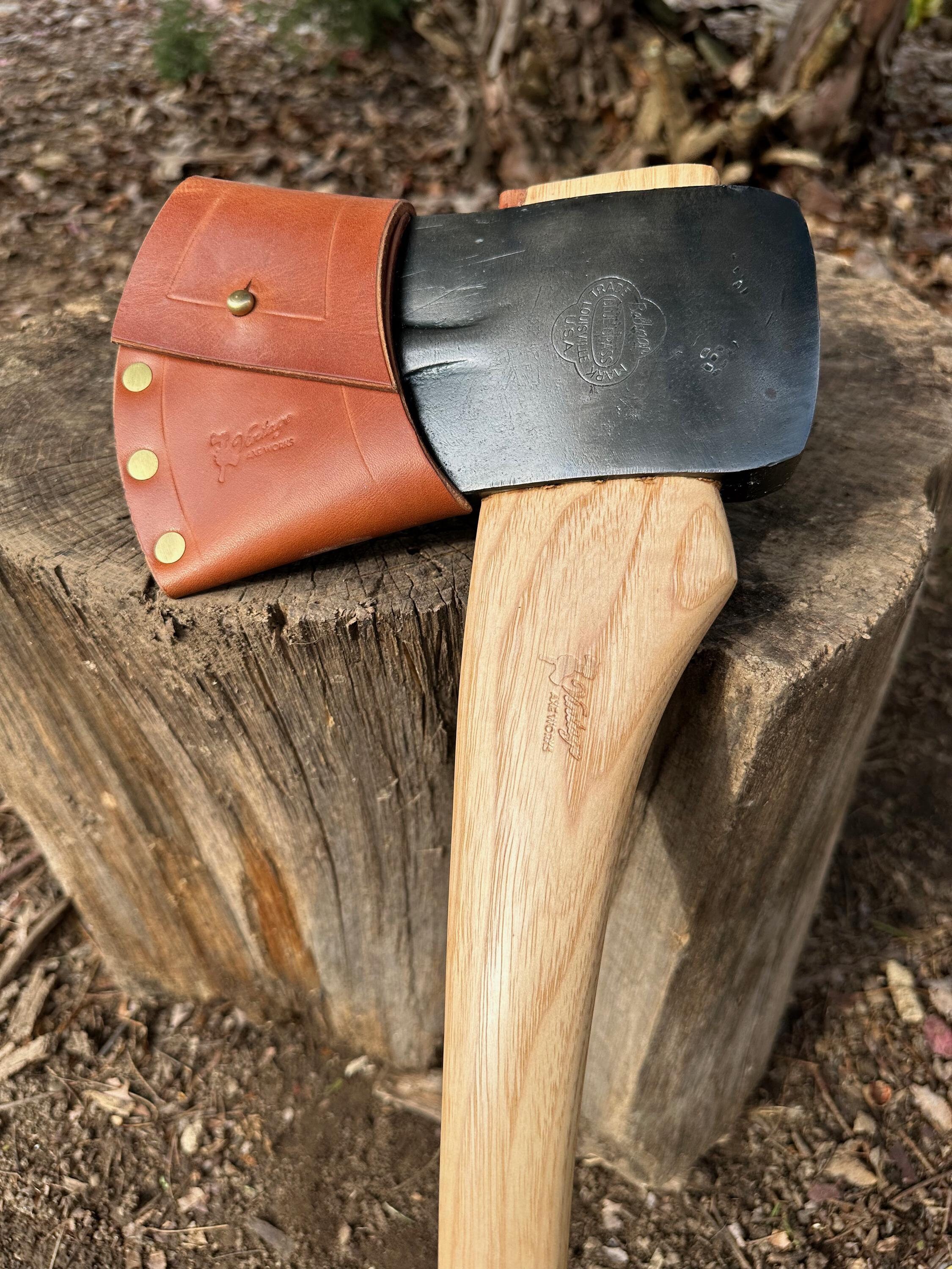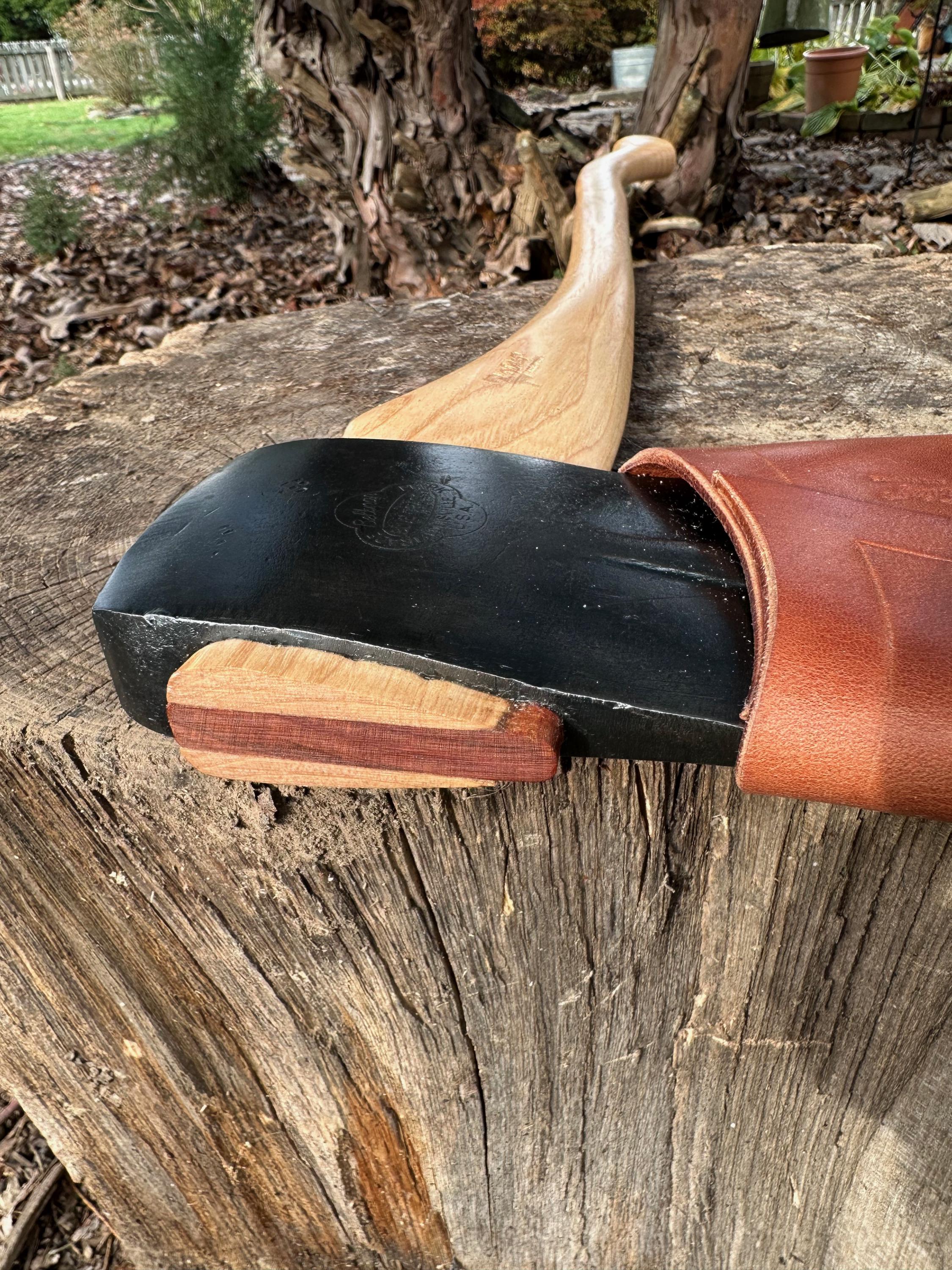 New handle is has been HAND-SHAPED, hand sanded, soaked in Odie’s Oil and boiled linseed oil and hand-rubbed for a clean, smooth look and feel. Clean seal around top and bottom of eye and hung with a hardwood wedge – handle sticks out from head approximately 3/16”.
