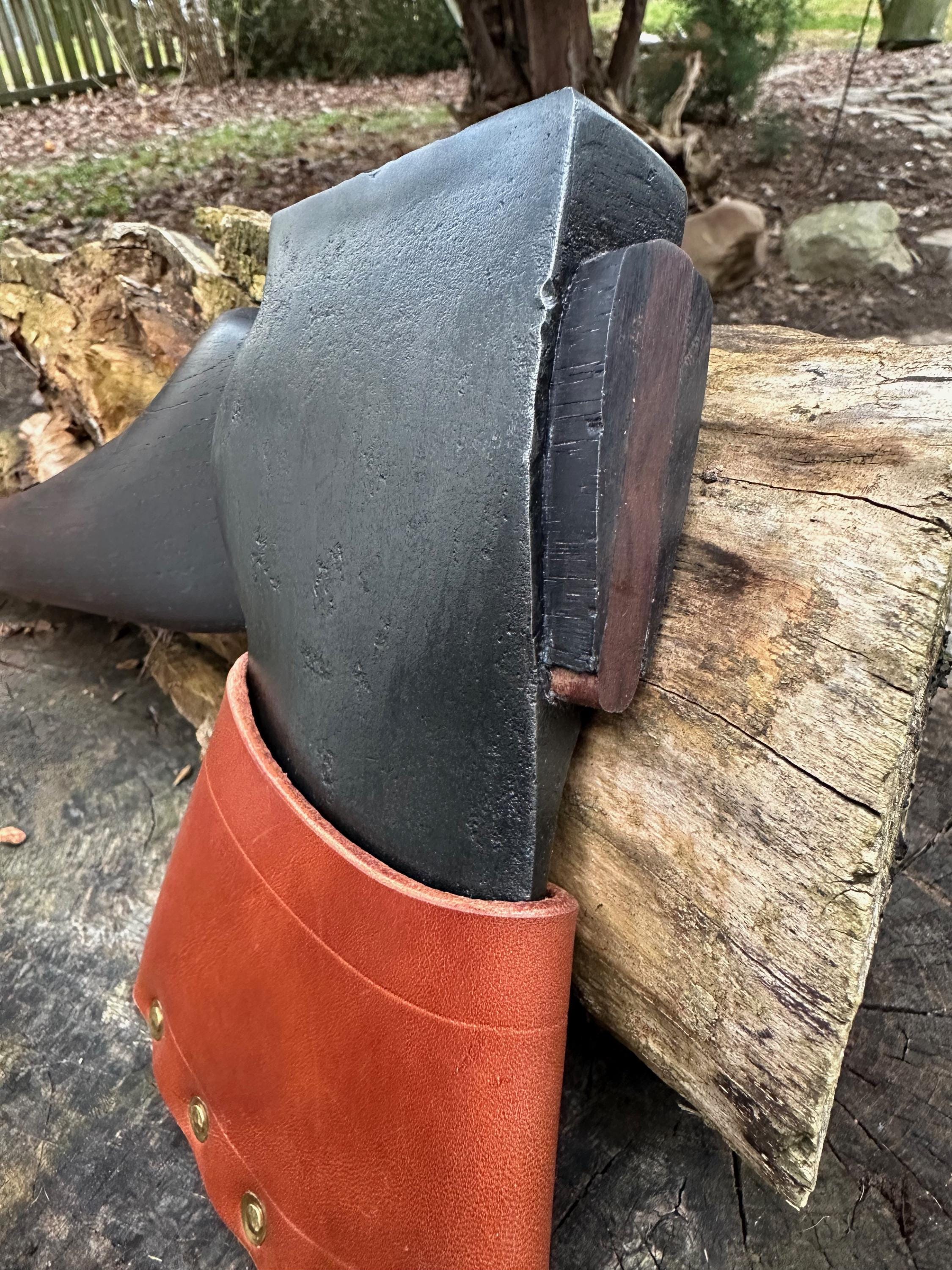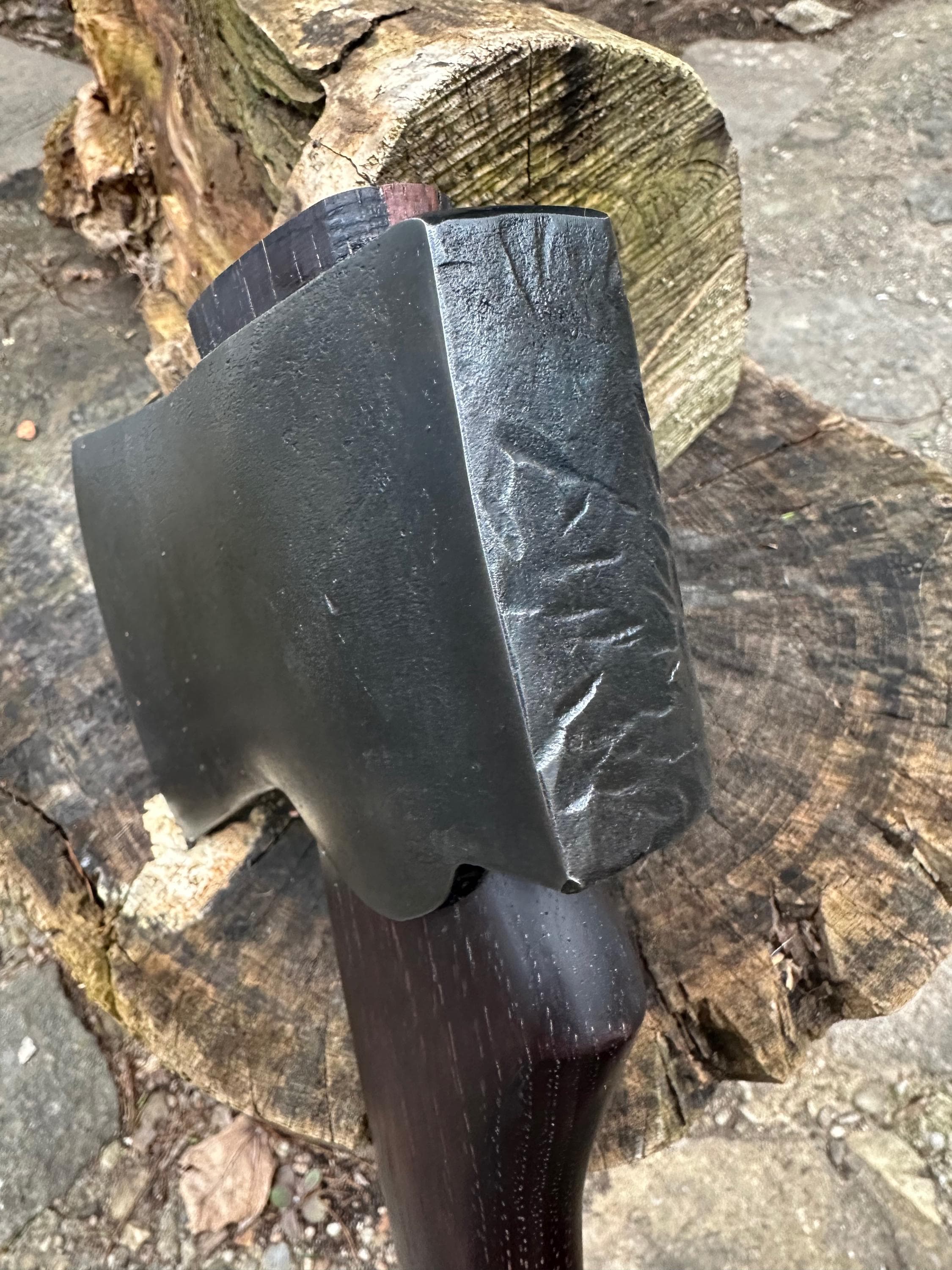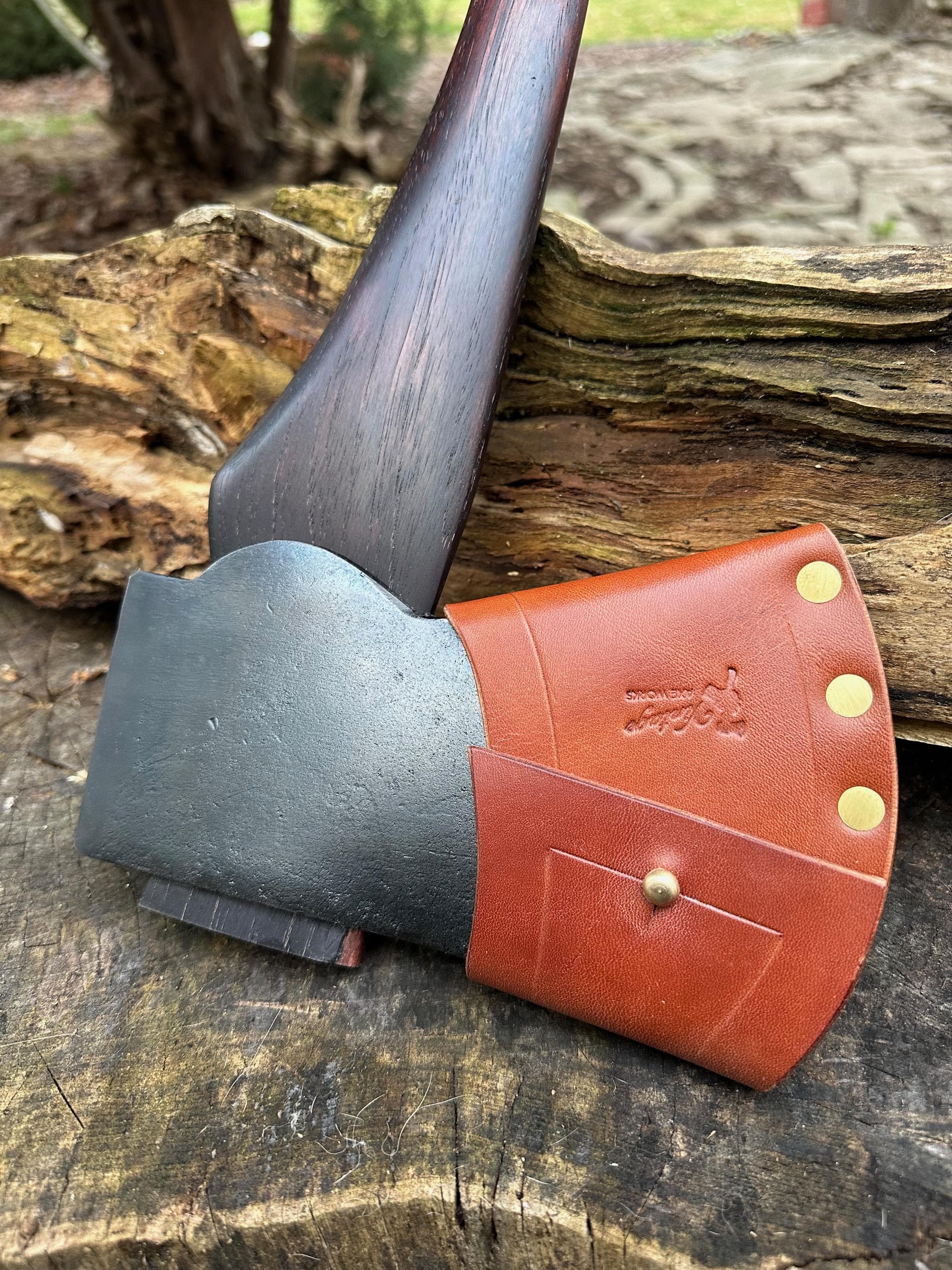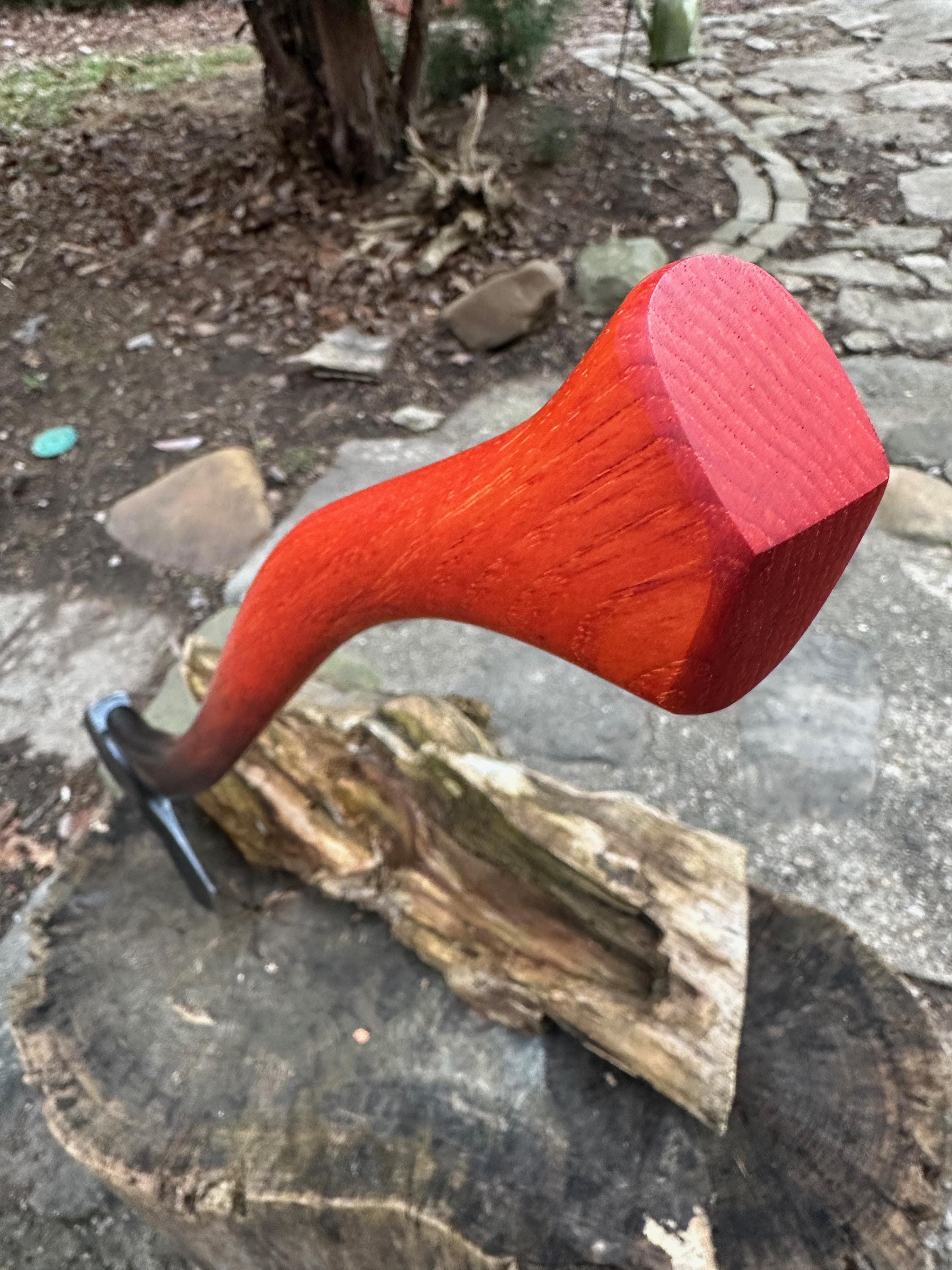 New French Curved handle has multiple coats of wood dye that fades from dark walnut to vibrant orange at the palm swell. HAND-SHAPED, hand sanded, soaked in Odie’s Oil and hand-rubbed for a clean, smooth look and feel. Clean seal around top and bottom of eye and hung with a hardwood wedge – handle sticks out from head approximately 3/16”.