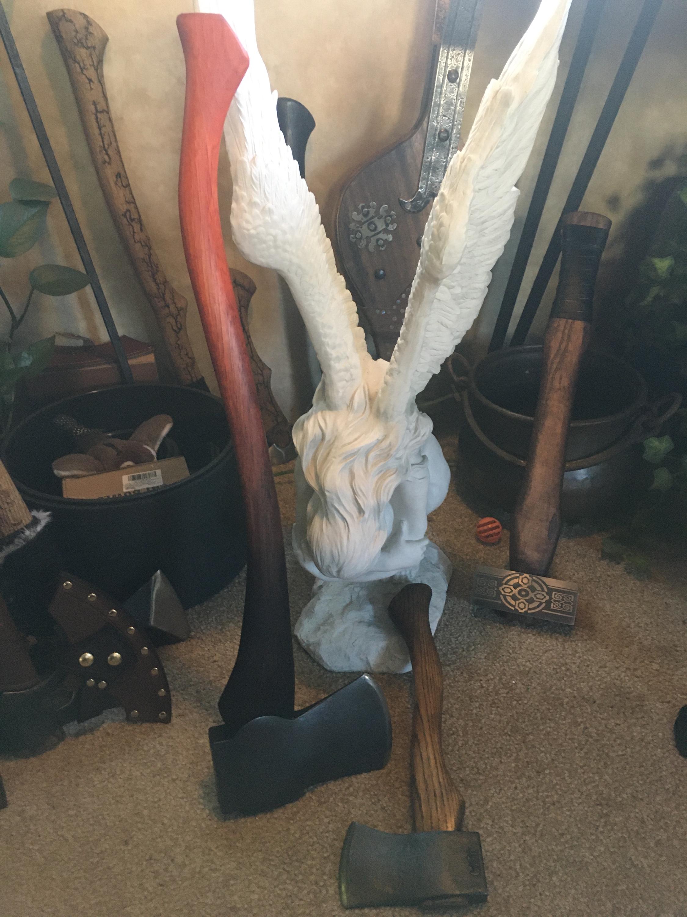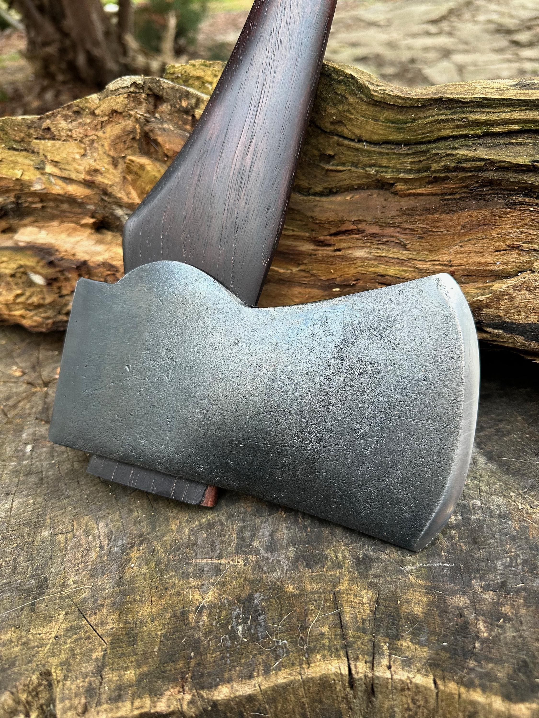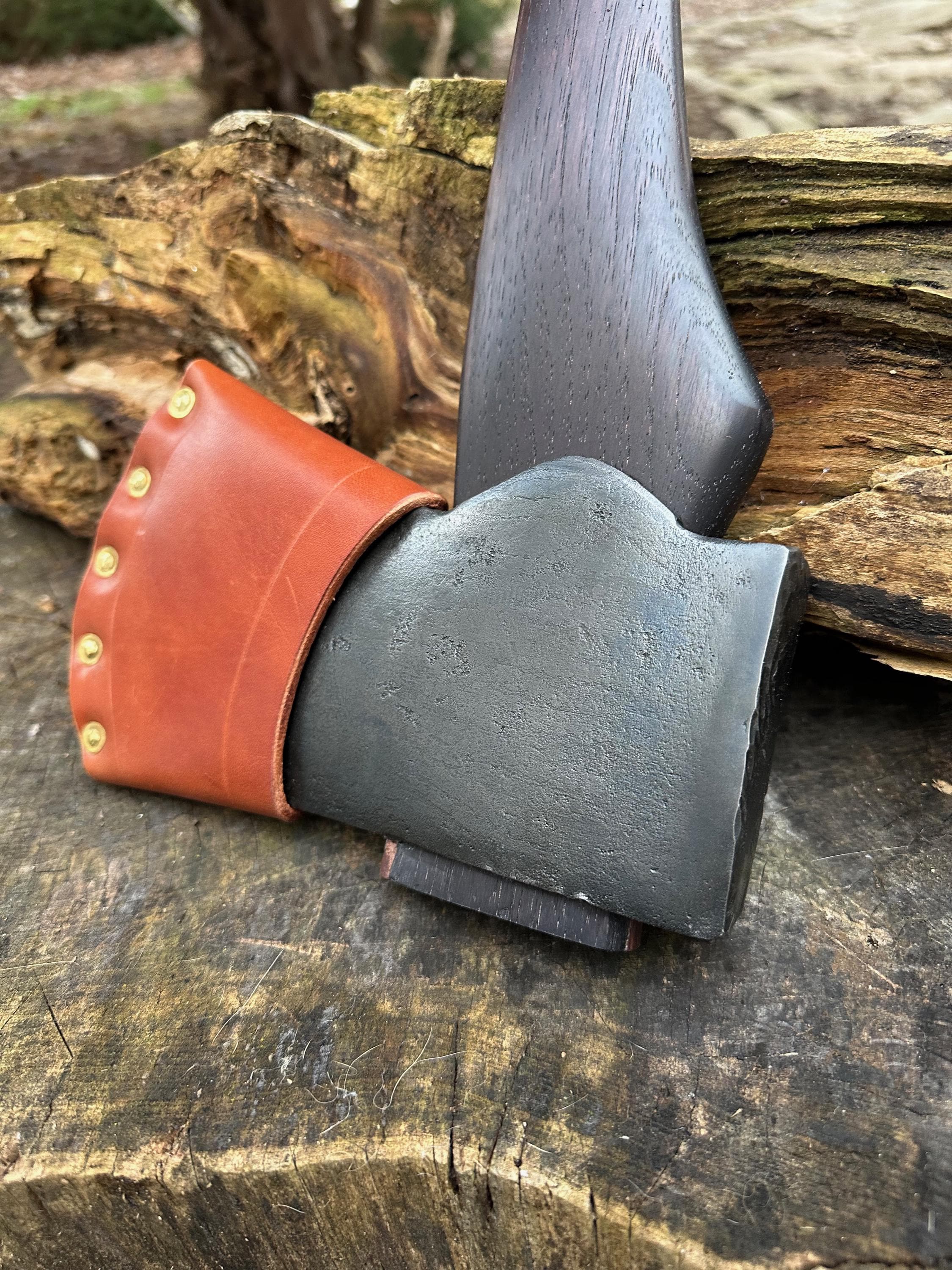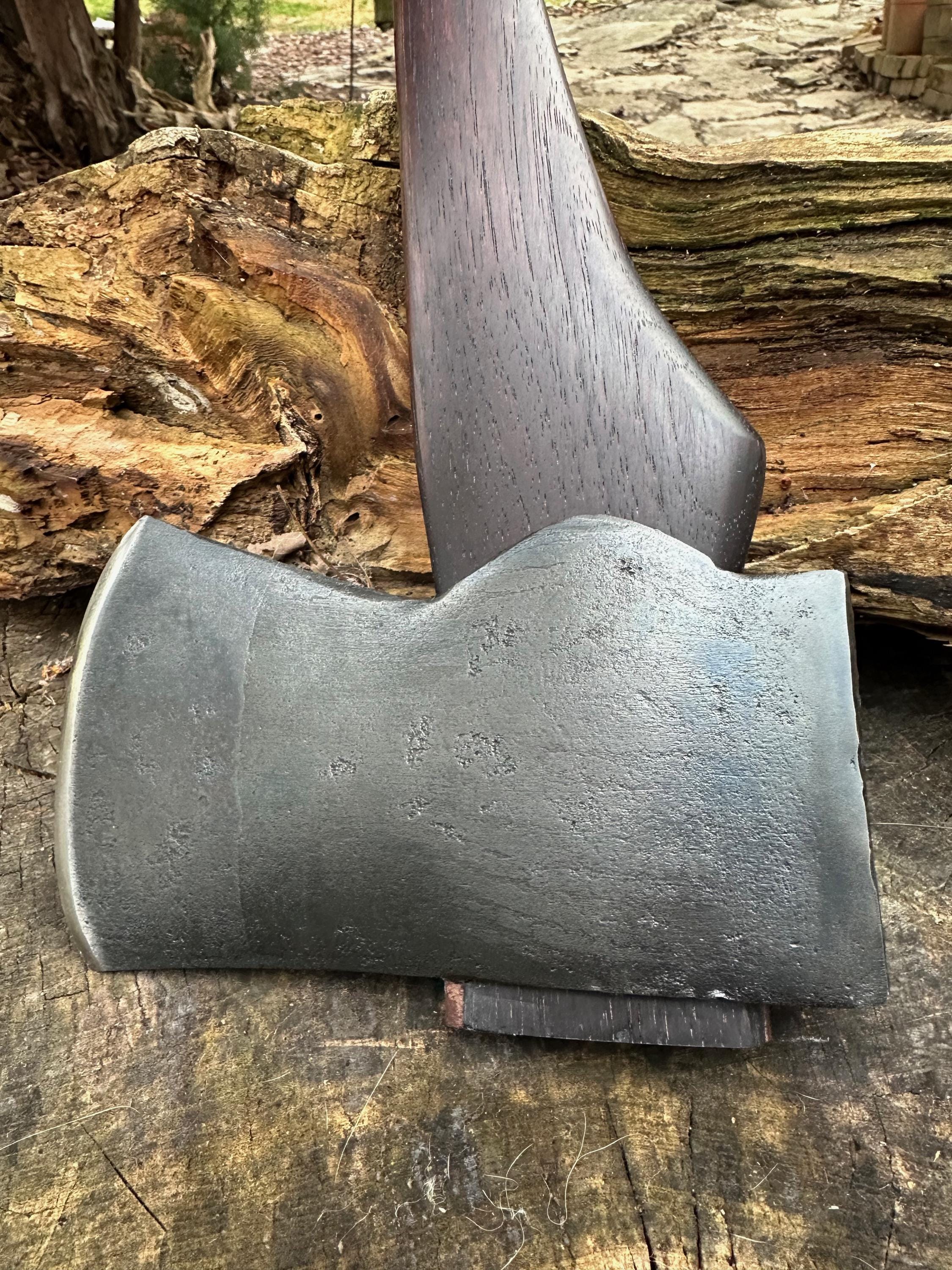 New French Curved handle has multiple coats of wood dye that fades from dark walnut to vibrant orange at the palm swell. HAND-SHAPED, hand sanded, soaked in Odie’s Oil and hand-rubbed for a clean, smooth look and feel. Clean seal around top and bottom of eye and hung with a hardwood wedge – handle sticks out from head approximately 3/16”.
