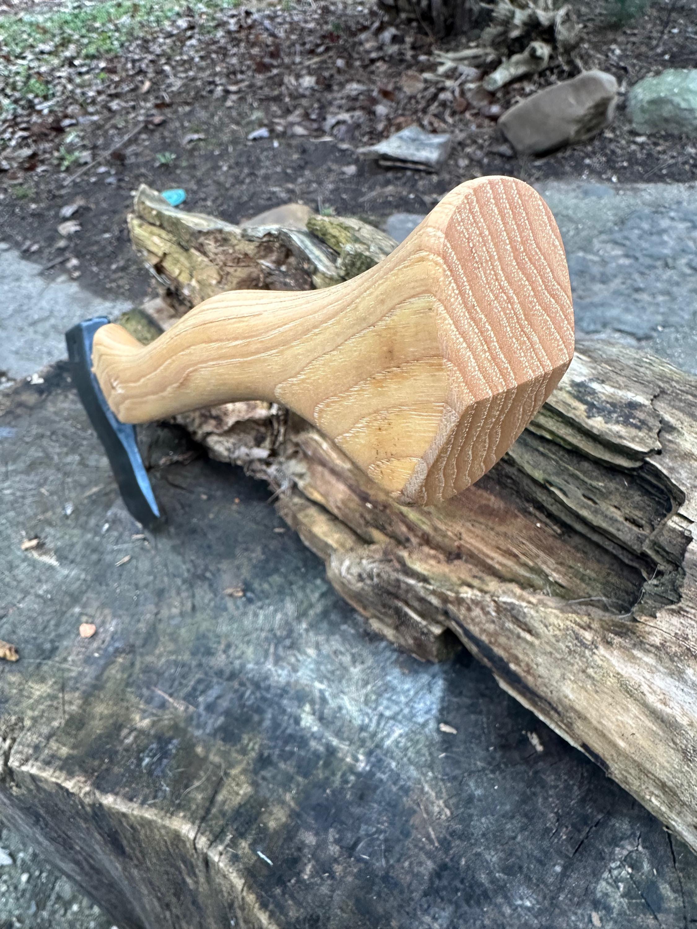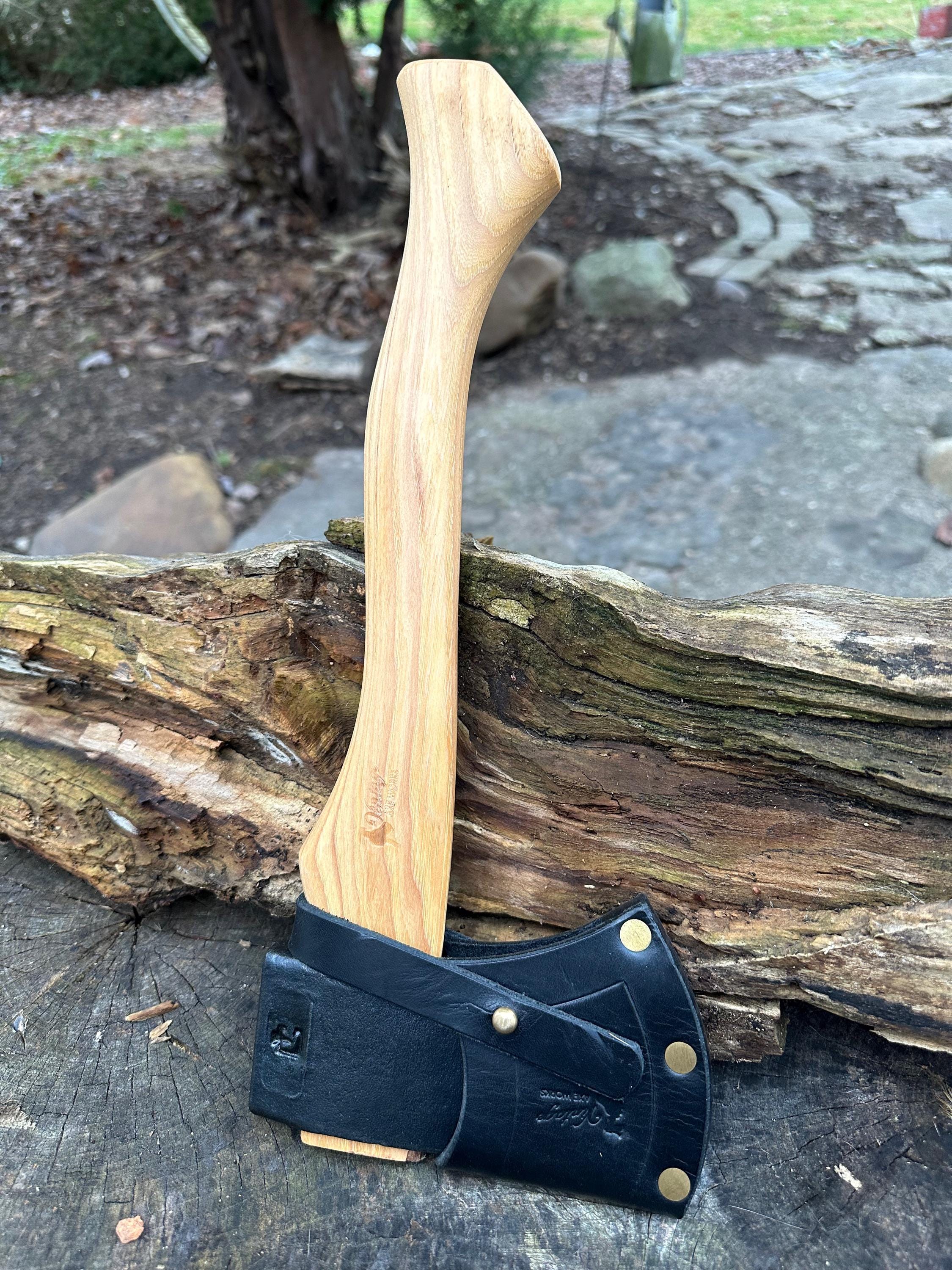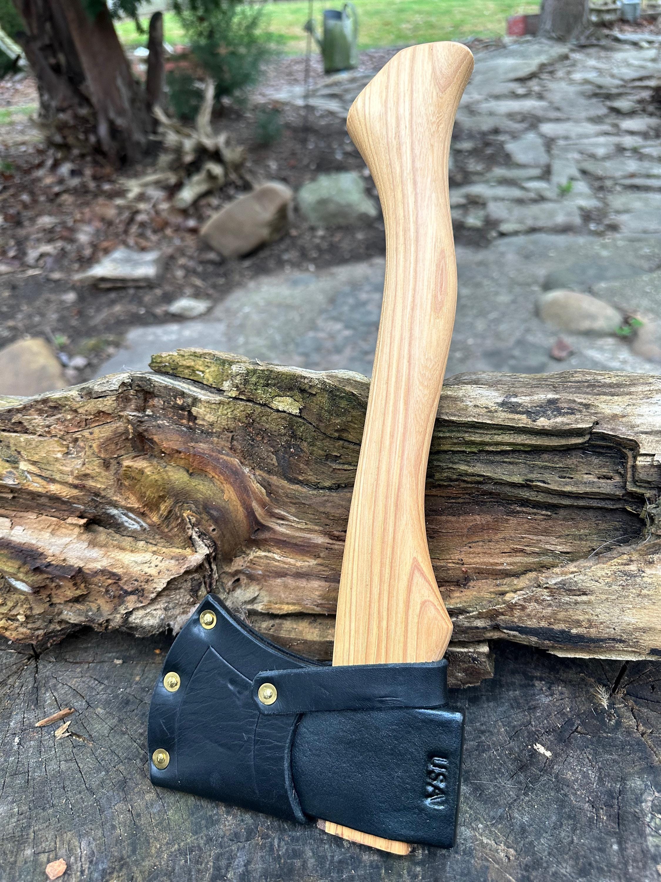 New handle is has been HAND-SHAPED, hand sanded, soaked in Odie’s Oil and boiled linseed oil and hand-rubbed for a clean, smooth look and feel. Clean seal around top and bottom of eye and hung with a hardwood wedge – handle sticks out from head approximately 3/16”.