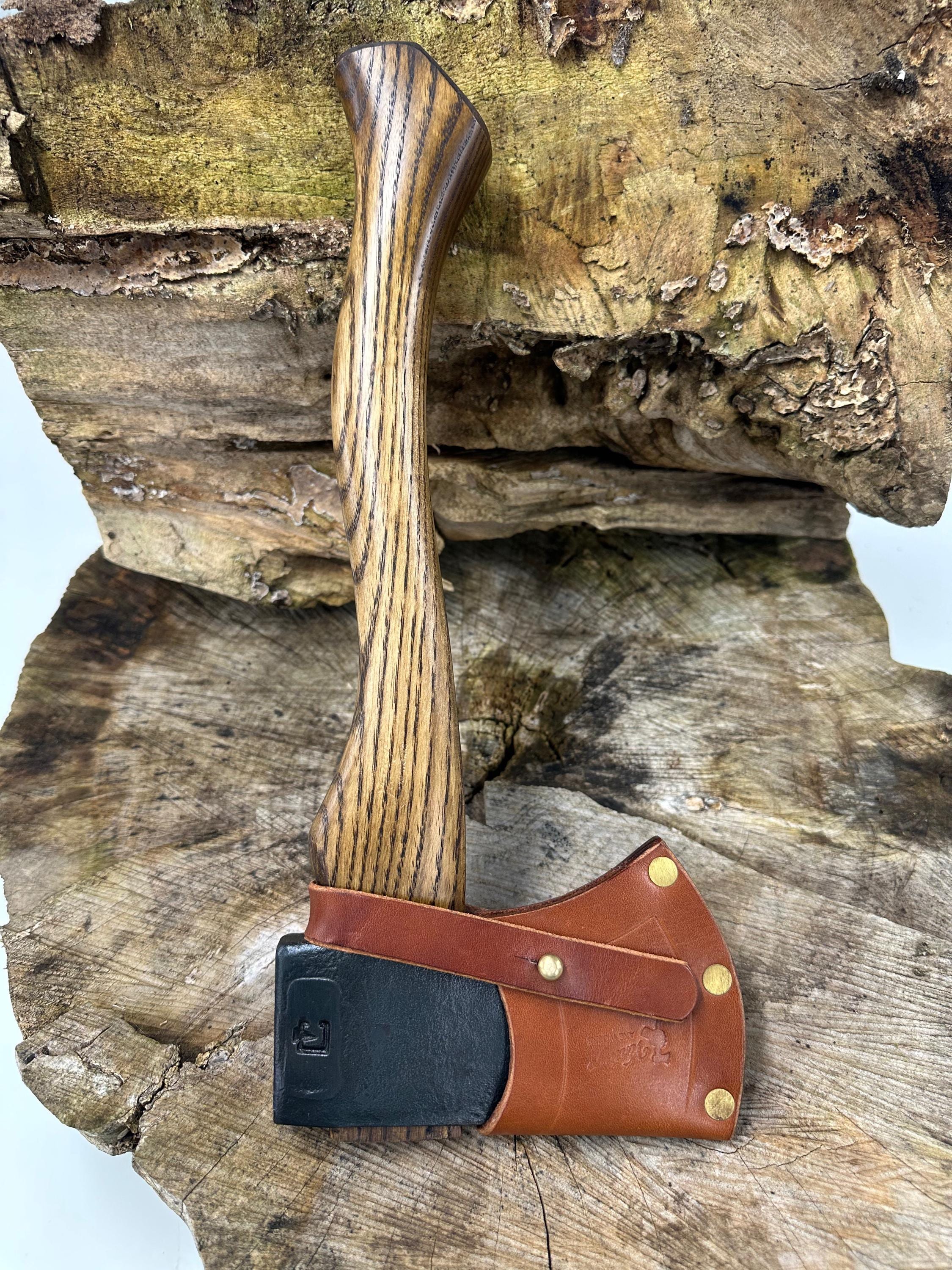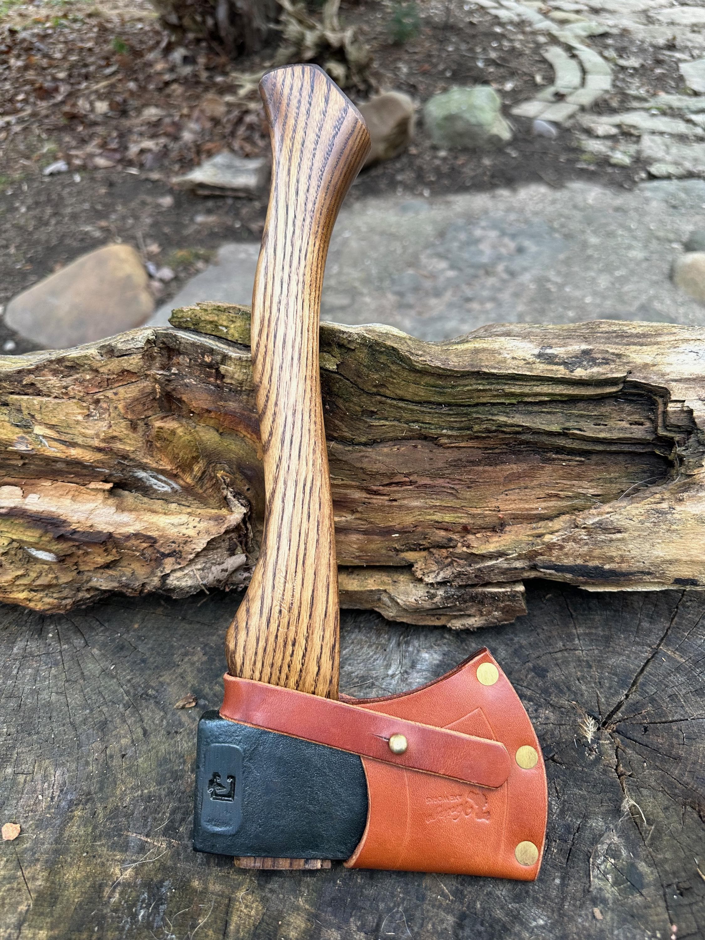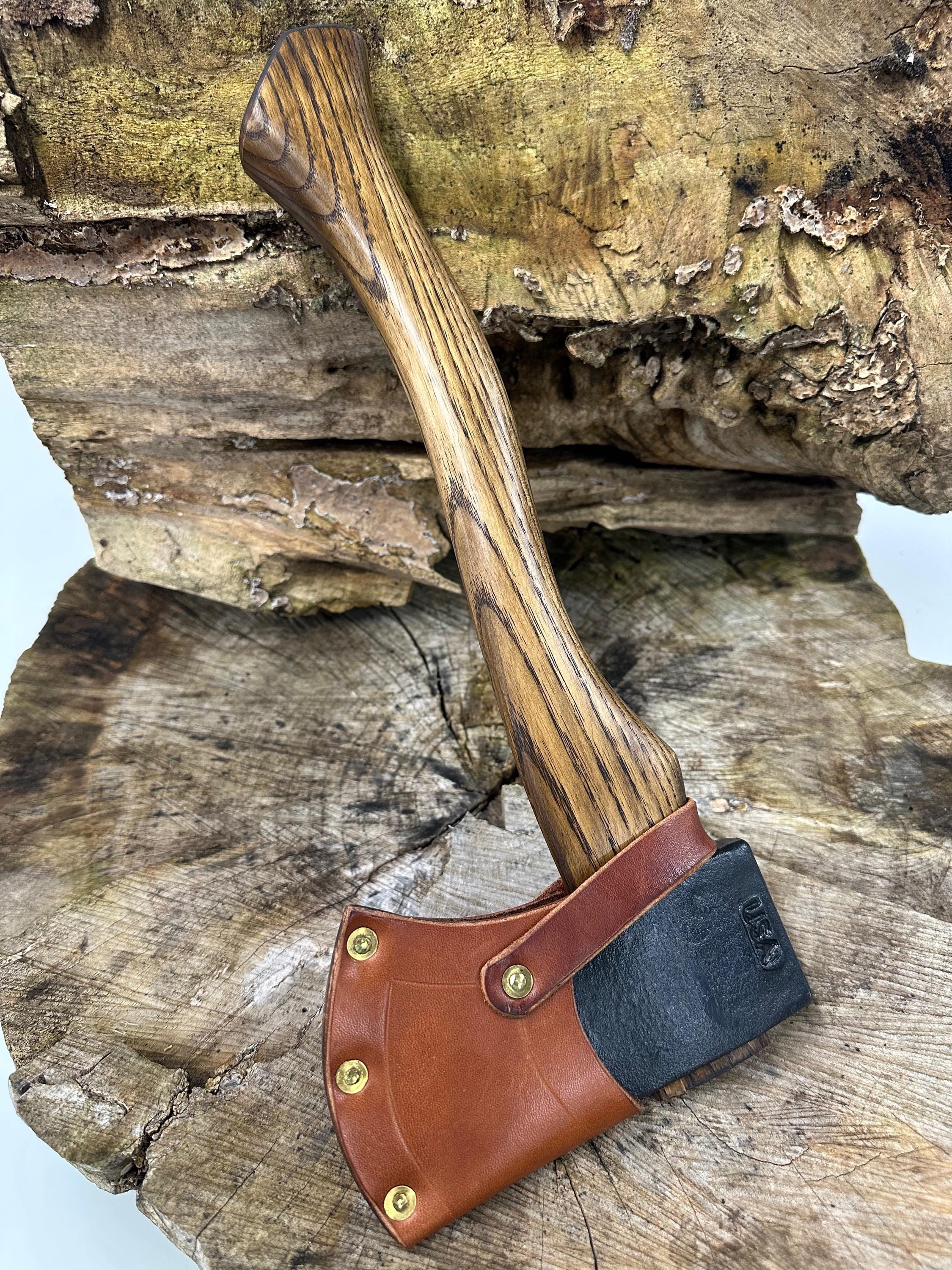 New ash handle has multiple coats of wood dye that darkens at the palm swell. HAND-SHAPED, hand sanded, soaked in Odie’s Oil and hand-rubbed for a clean, smooth look and feel. Clean seal around top and bottom of eye and hung with a hardwood wedge – handle sticks out from head approximately 3/16”.