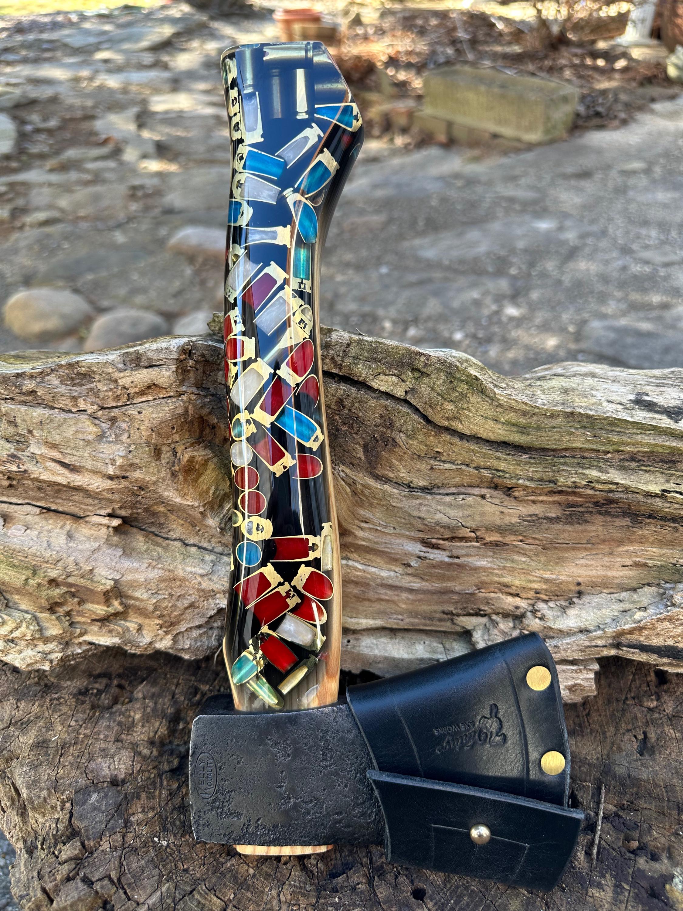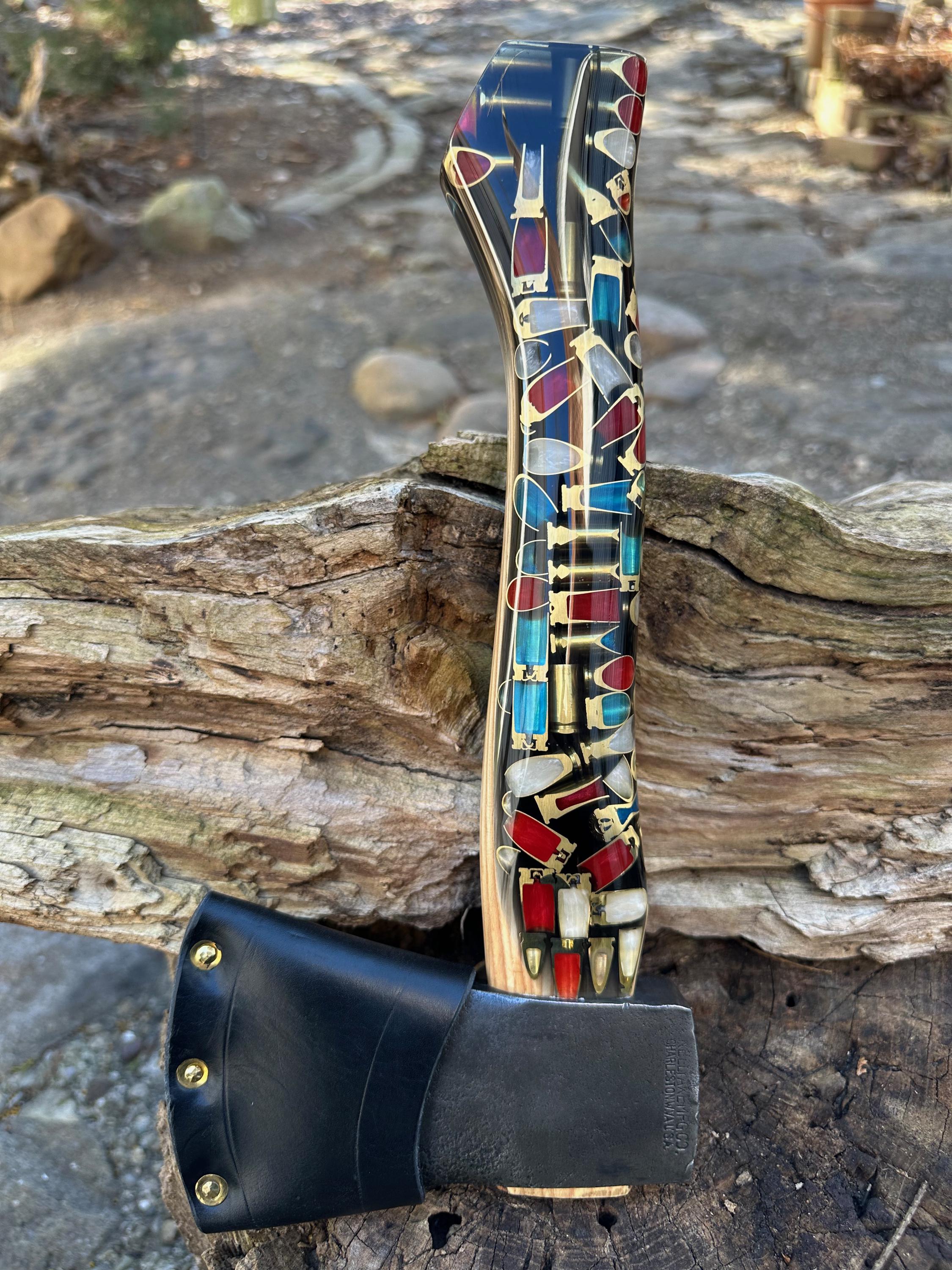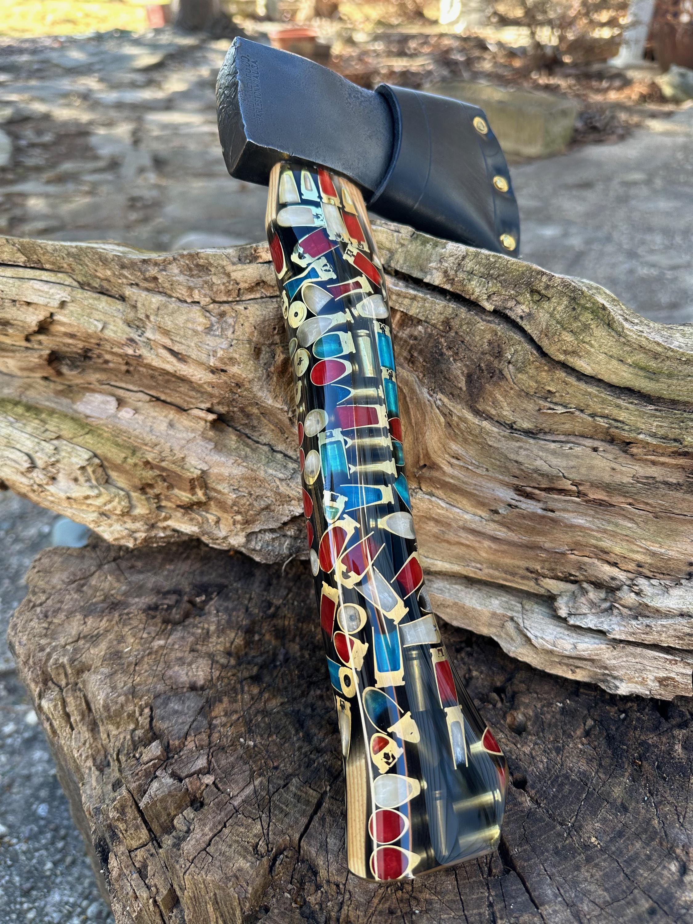 New handle has been cast with Total Boat High Performance 2:1 Epoxy and has an edge joined hickory core. Handle was created with spent 9mm casings filled with red, white, and blue metallic iridescent epoxy and then cast with black transparent dye, allowing the casings to be visible through the epoxy. The epoxy has been polished to a glass-like finish and is stunningly beautiful. There are a few exposed pieces of brass that can be felt and seen.