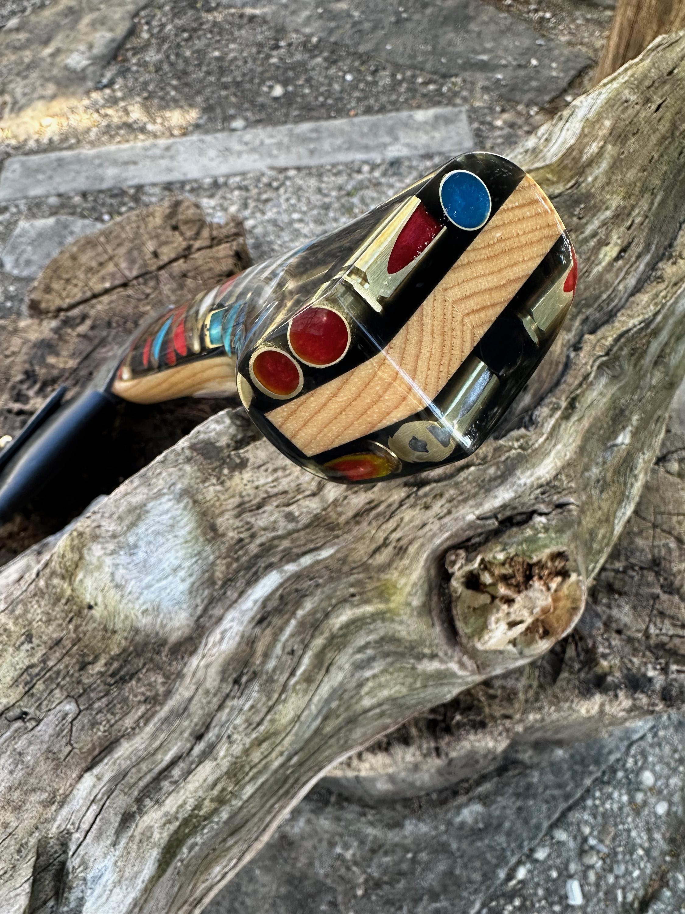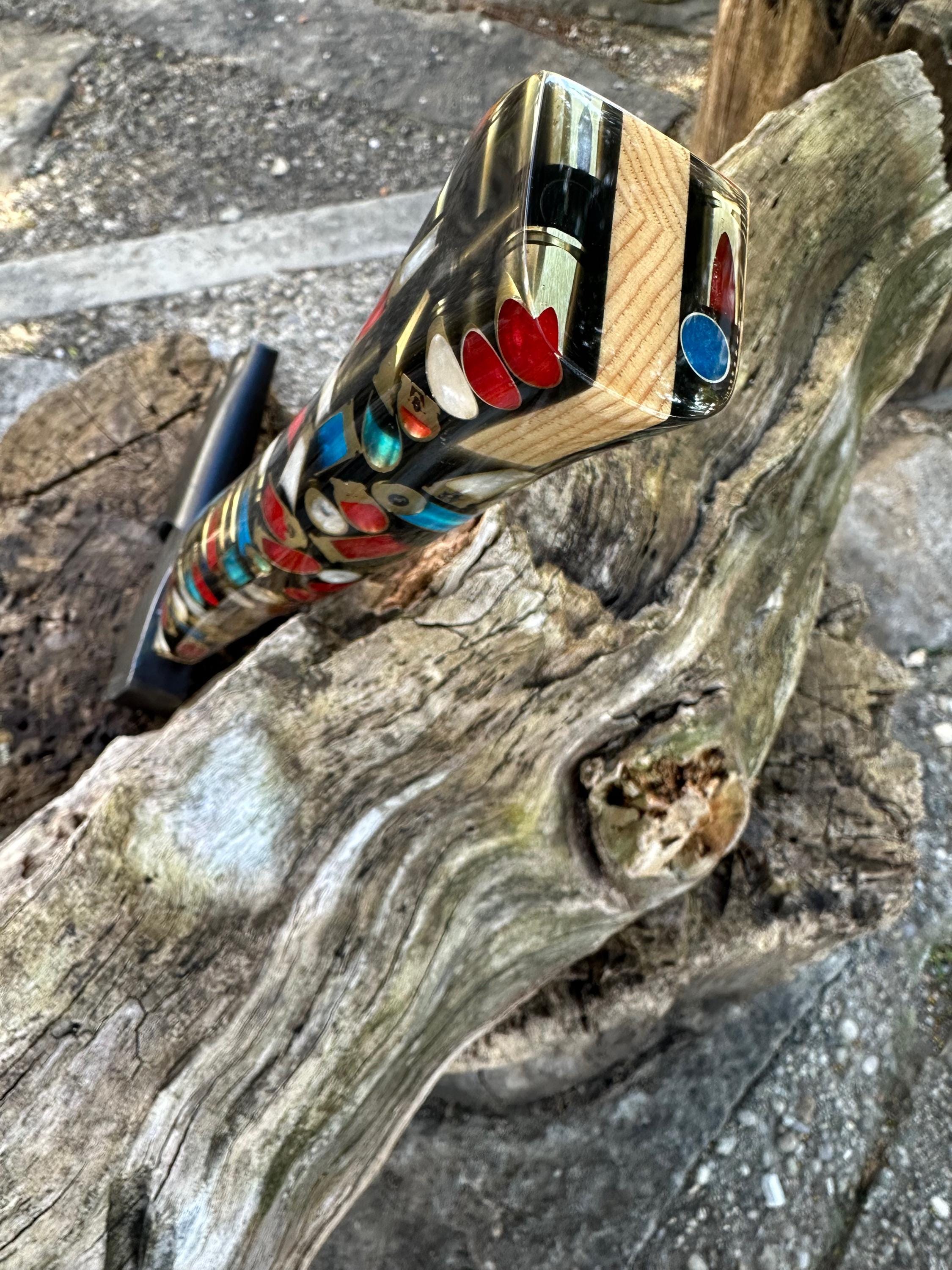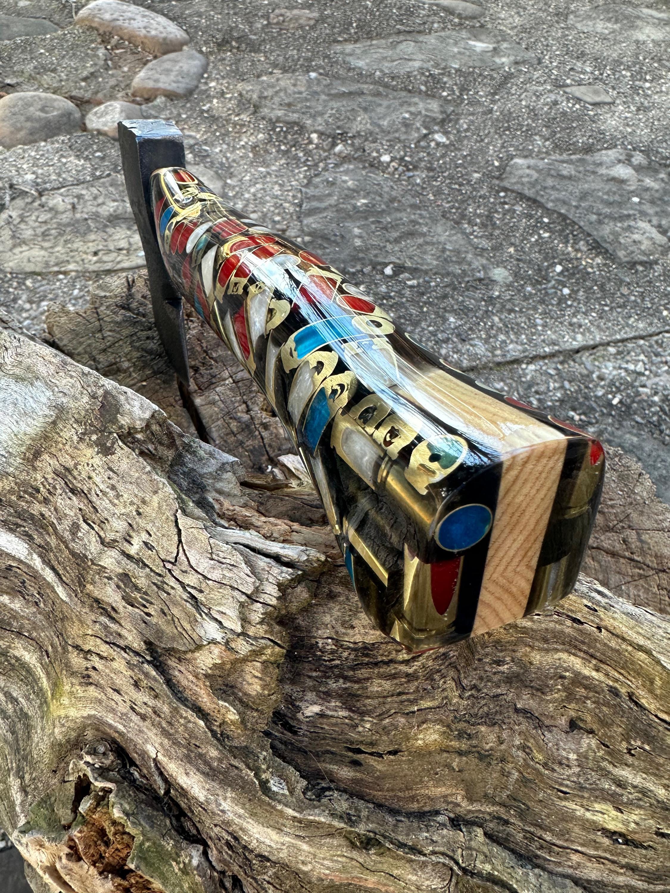 New handle has been cast with Total Boat High Performance 2:1 Epoxy and has an edge joined hickory core. Handle was created with spent 9mm casings filled with red, white, and blue metallic iridescent epoxy and then cast with black transparent dye, allowing the casings to be visible through the epoxy. The epoxy has been polished to a glass-like finish and is stunningly beautiful. There are a few exposed pieces of brass that can be felt and seen.