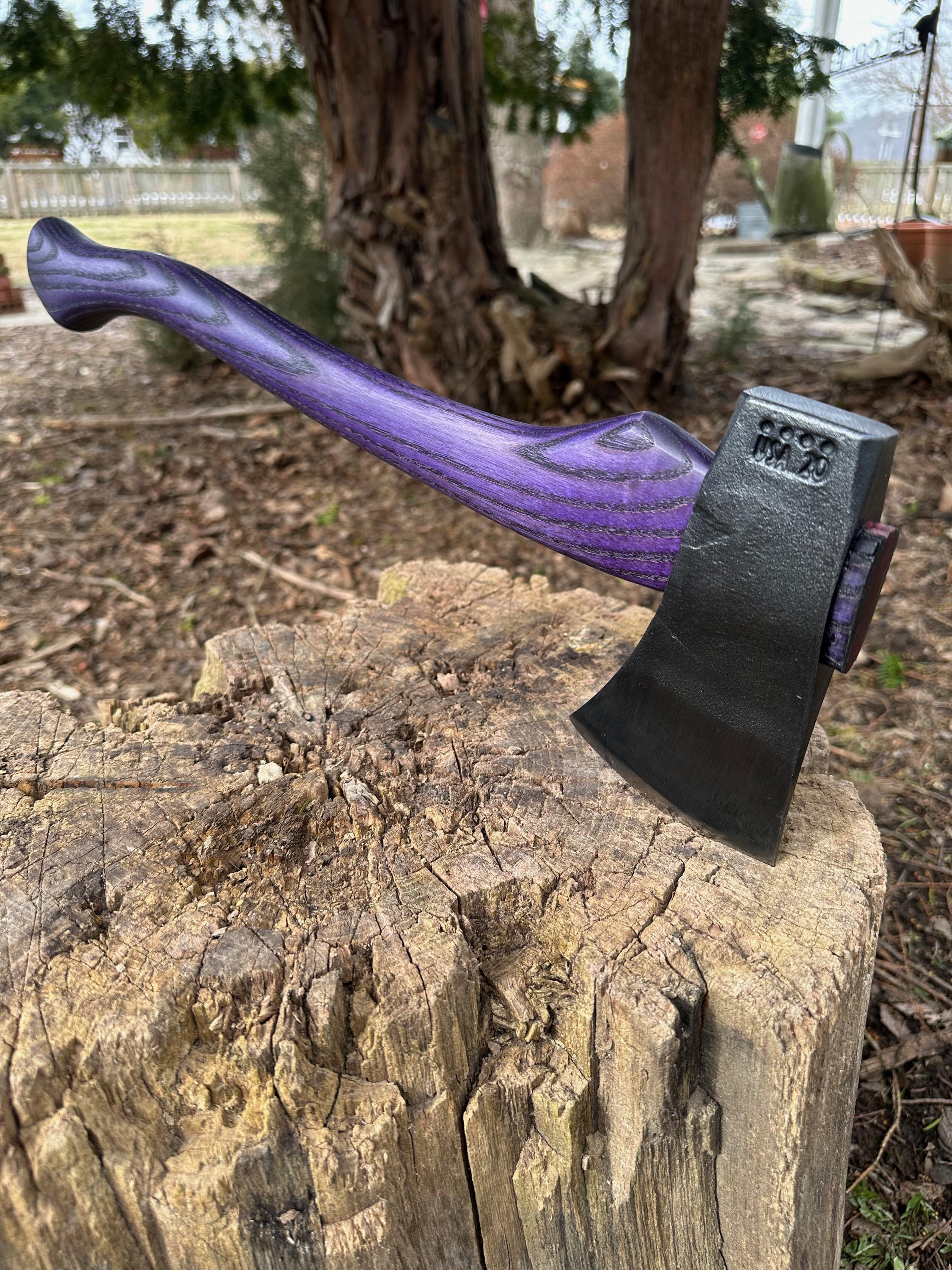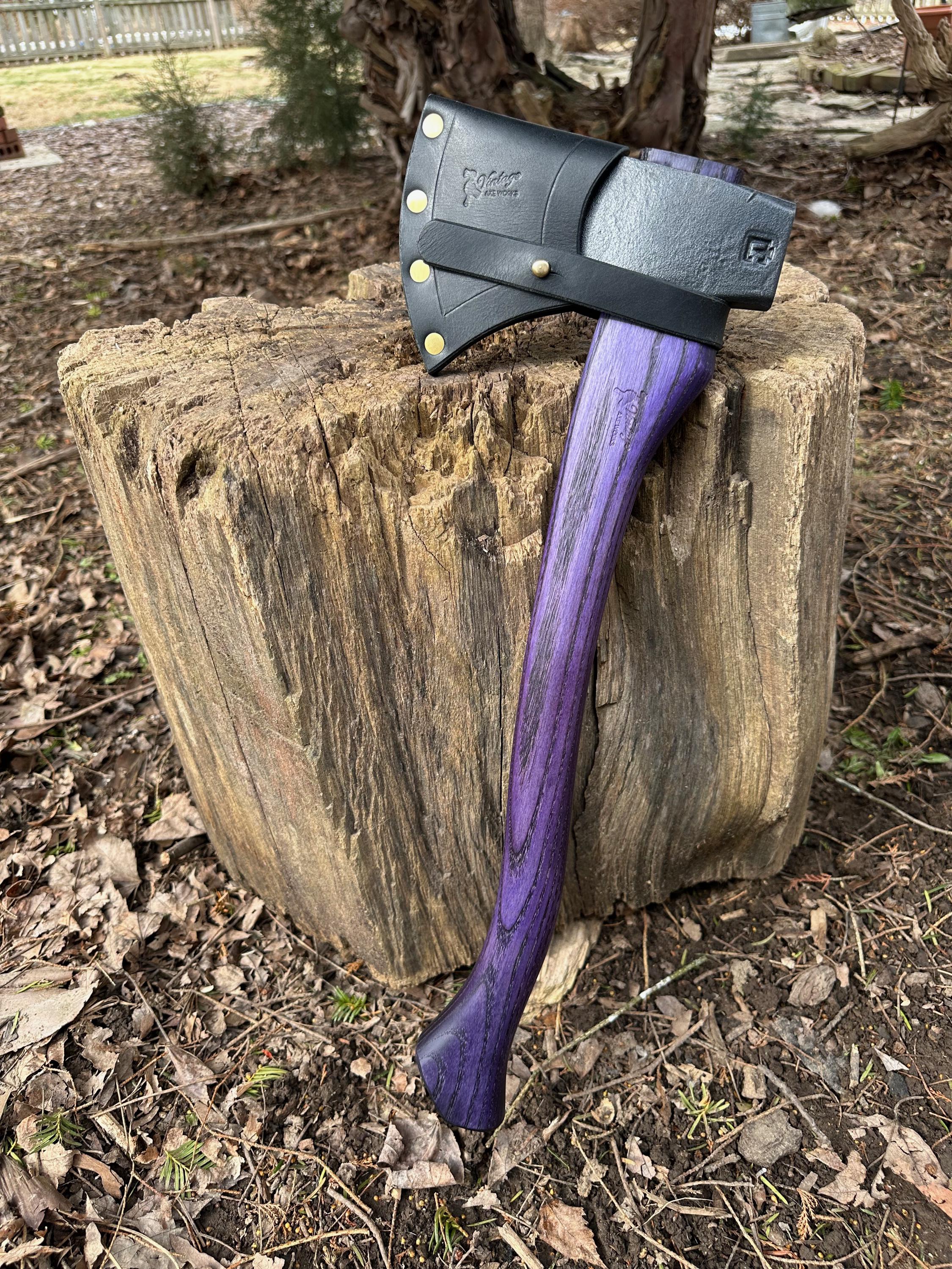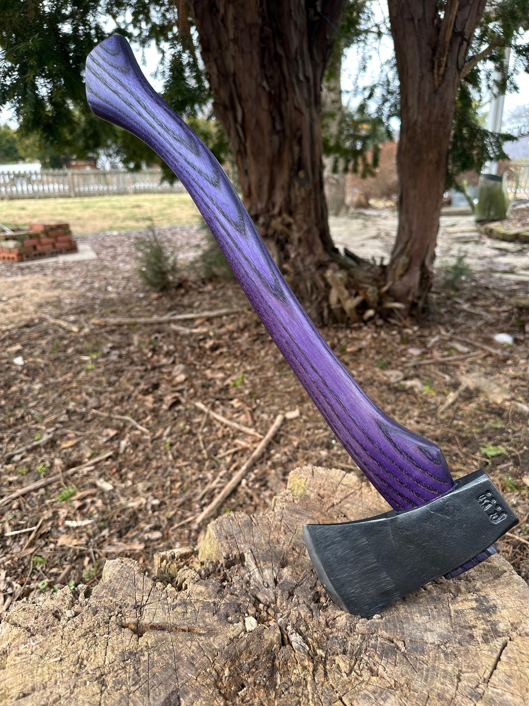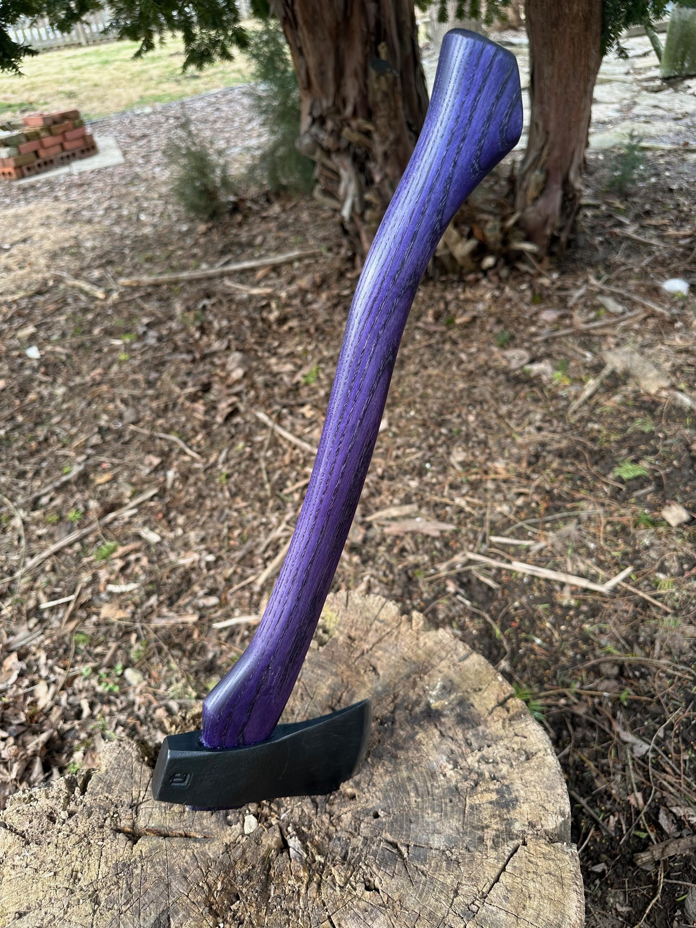 New ash handle has been double-dyed in purple over black for deep color saturation. HAND-SHAPED, hand sanded, soaked in Odie’s Oil and hand-rubbed for a clean, smooth look and feel. Clean seal around top and bottom of eye and hung with a hardwood wedge – handle sticks out from head approximately 3/16”.