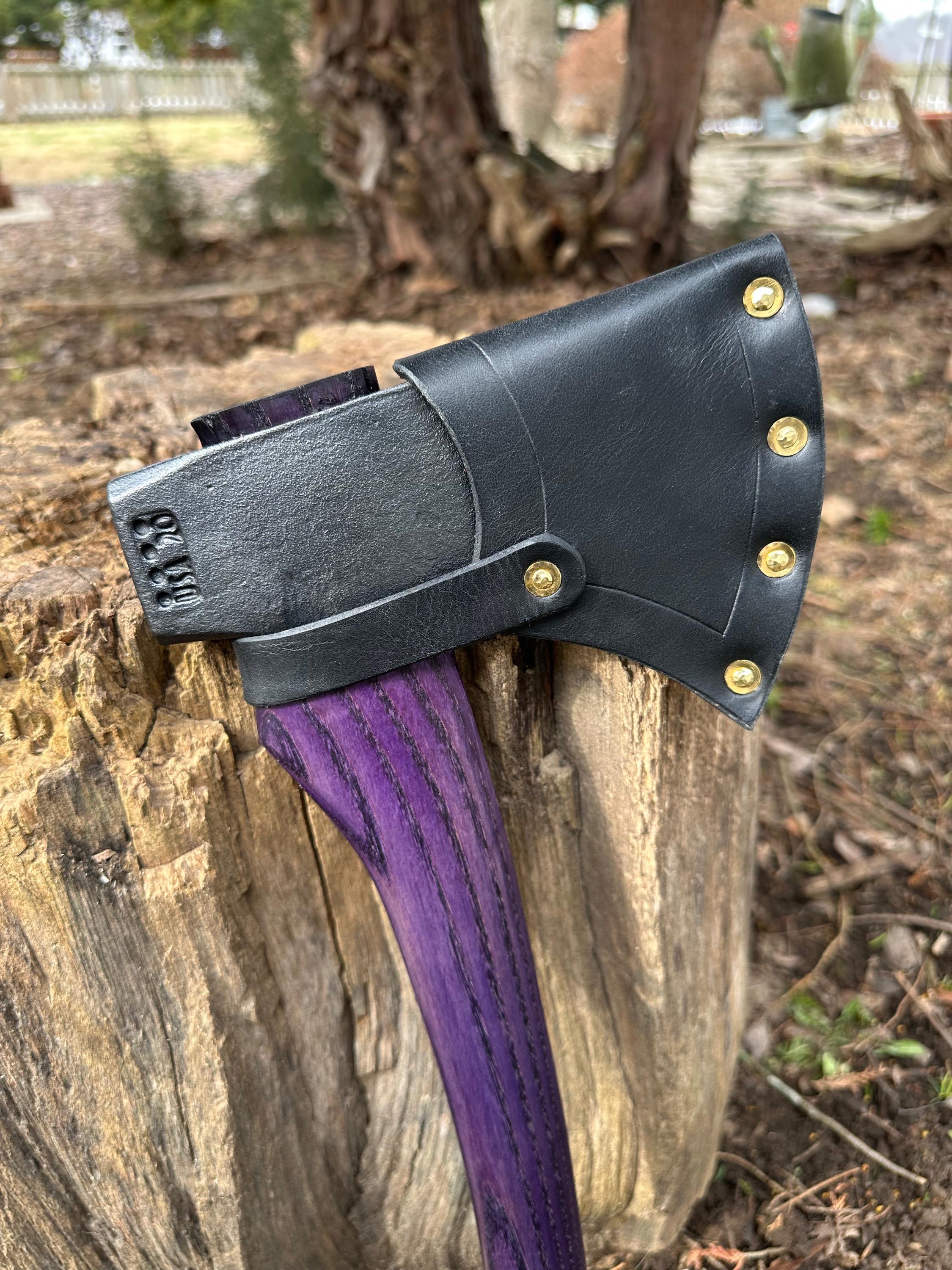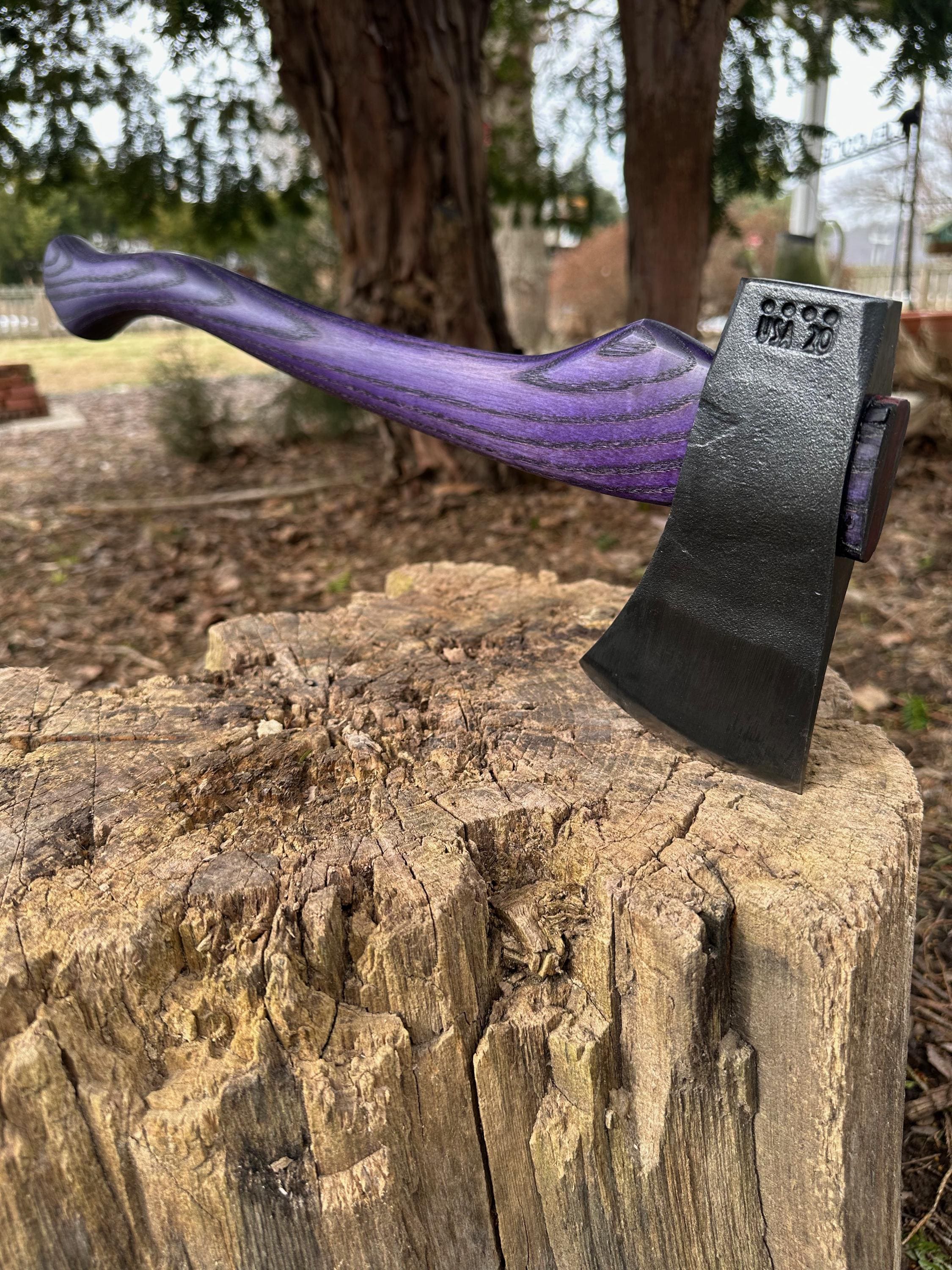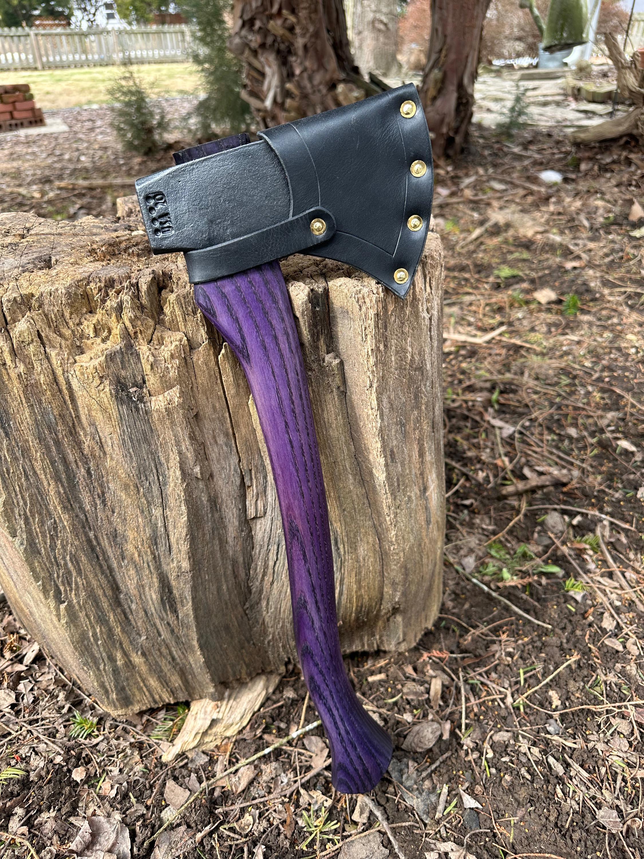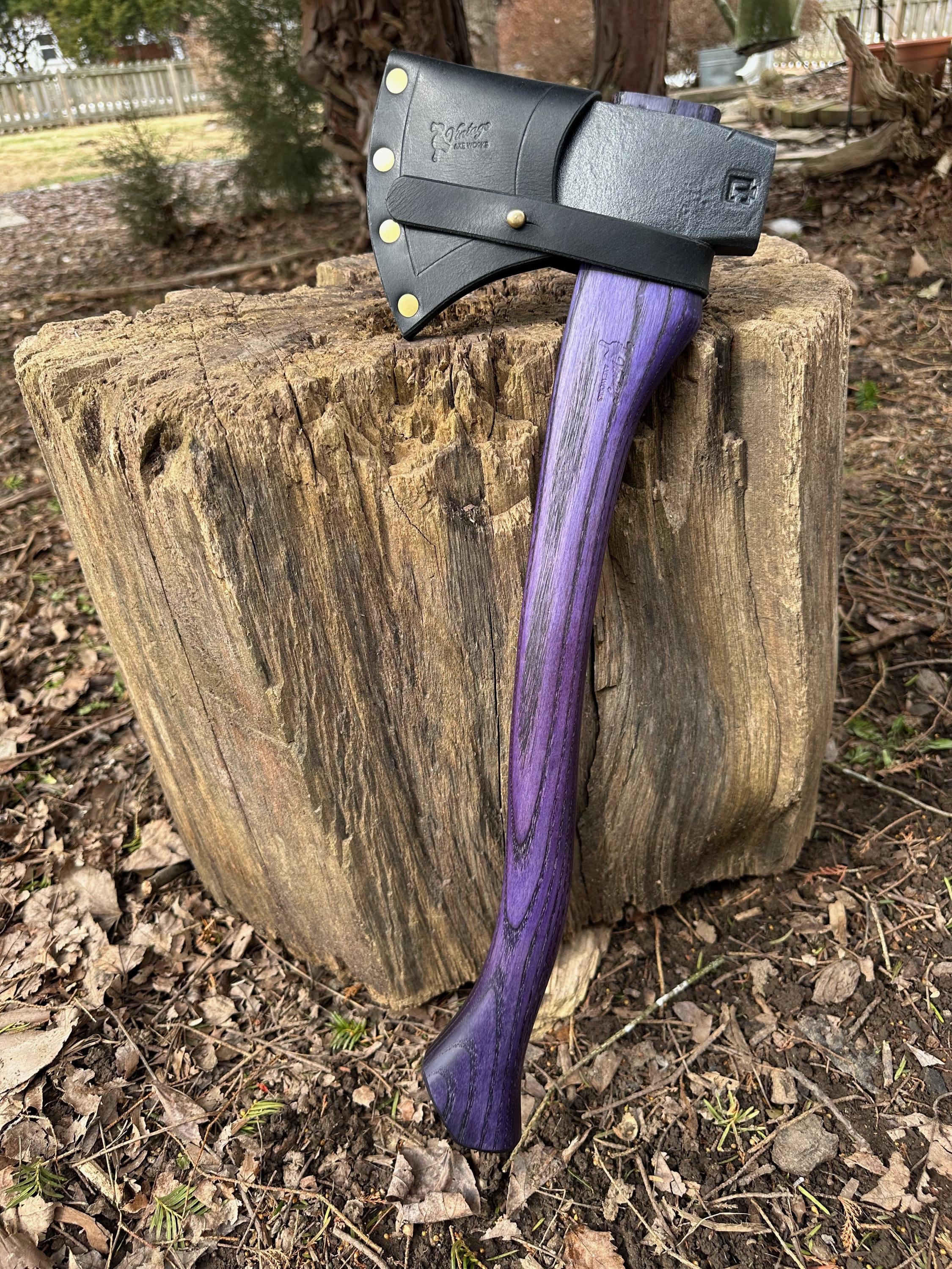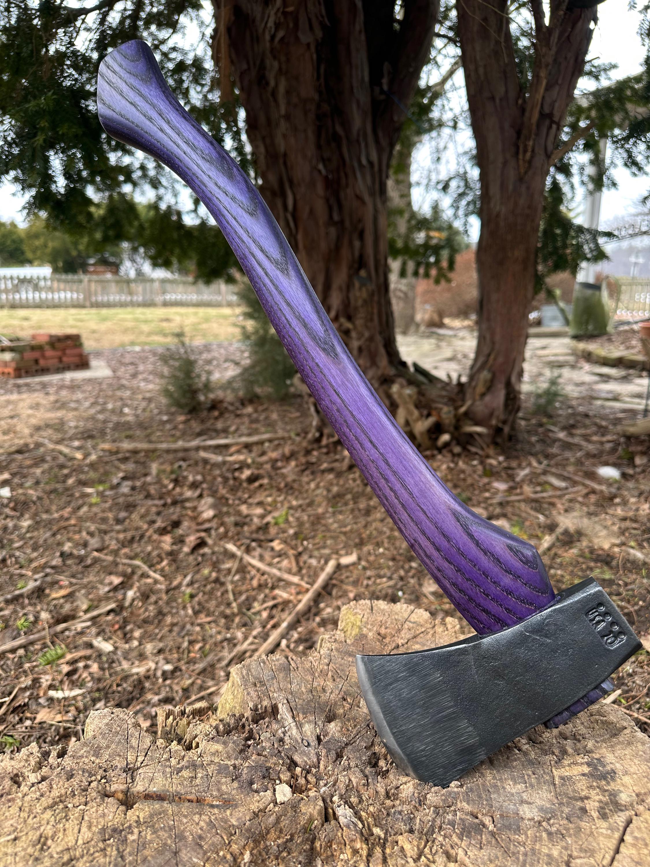 New ash handle has been double-dyed in purple over black for deep color saturation. HAND-SHAPED, hand sanded, soaked in Odie’s Oil and hand-rubbed for a clean, smooth look and feel. Clean seal around top and bottom of eye and hung with a hardwood wedge – handle sticks out from head approximately 3/16”.