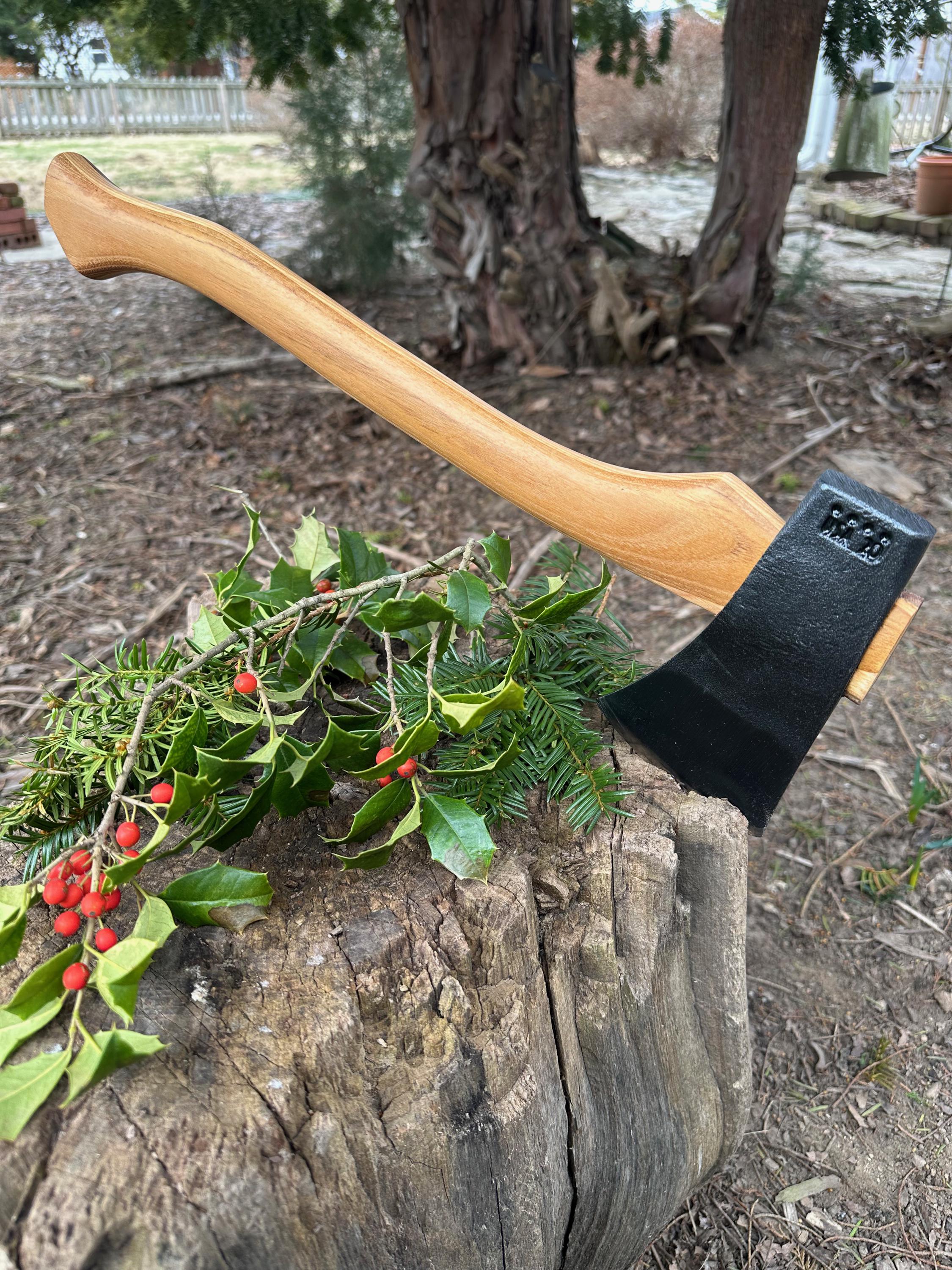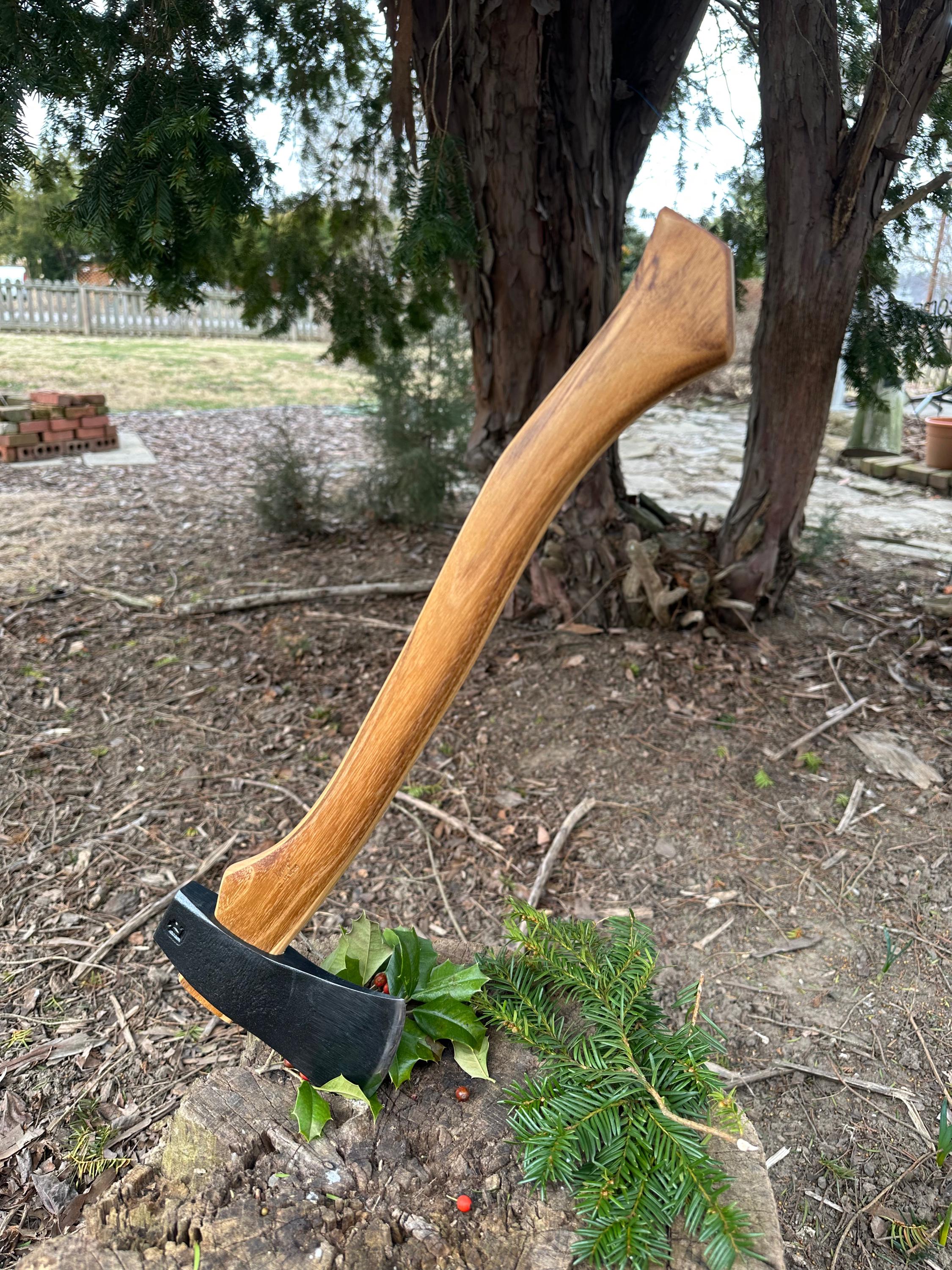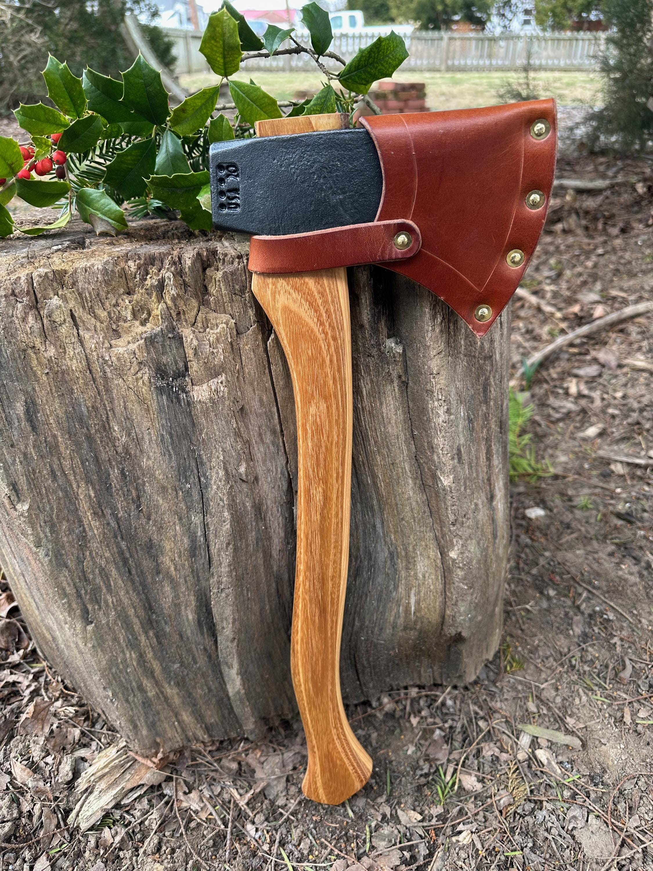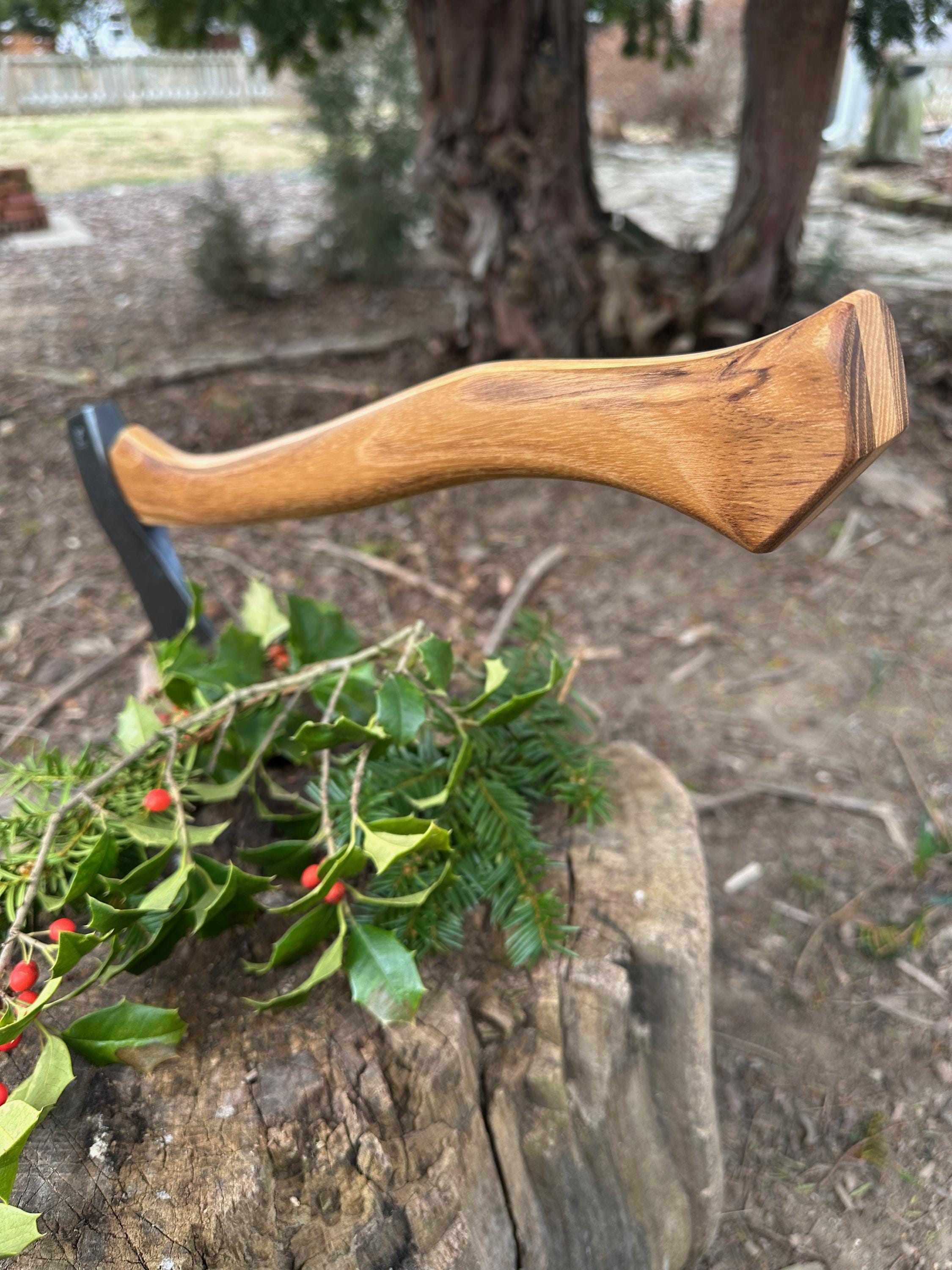 New laminated handle is made of black locust over hickory and has beautiful streaking throughout . HAND-SHAPED, hand sanded, soaked in Odie’s Oil and hand-rubbed for a clean, smooth look and feel. Clean seal around top and bottom of eye and hung with a hardwood wedge – handle sticks out from head approximately 3/16”.