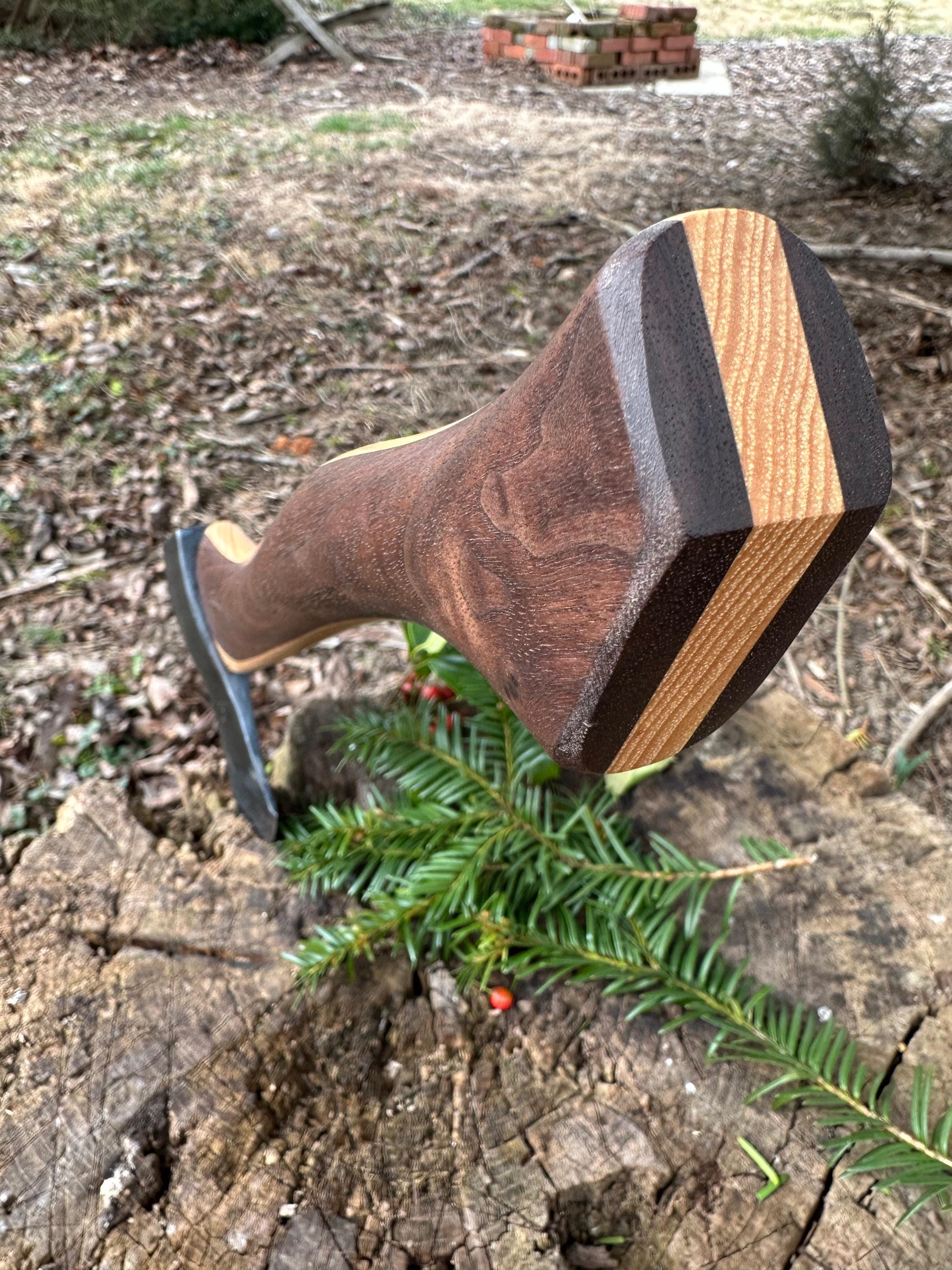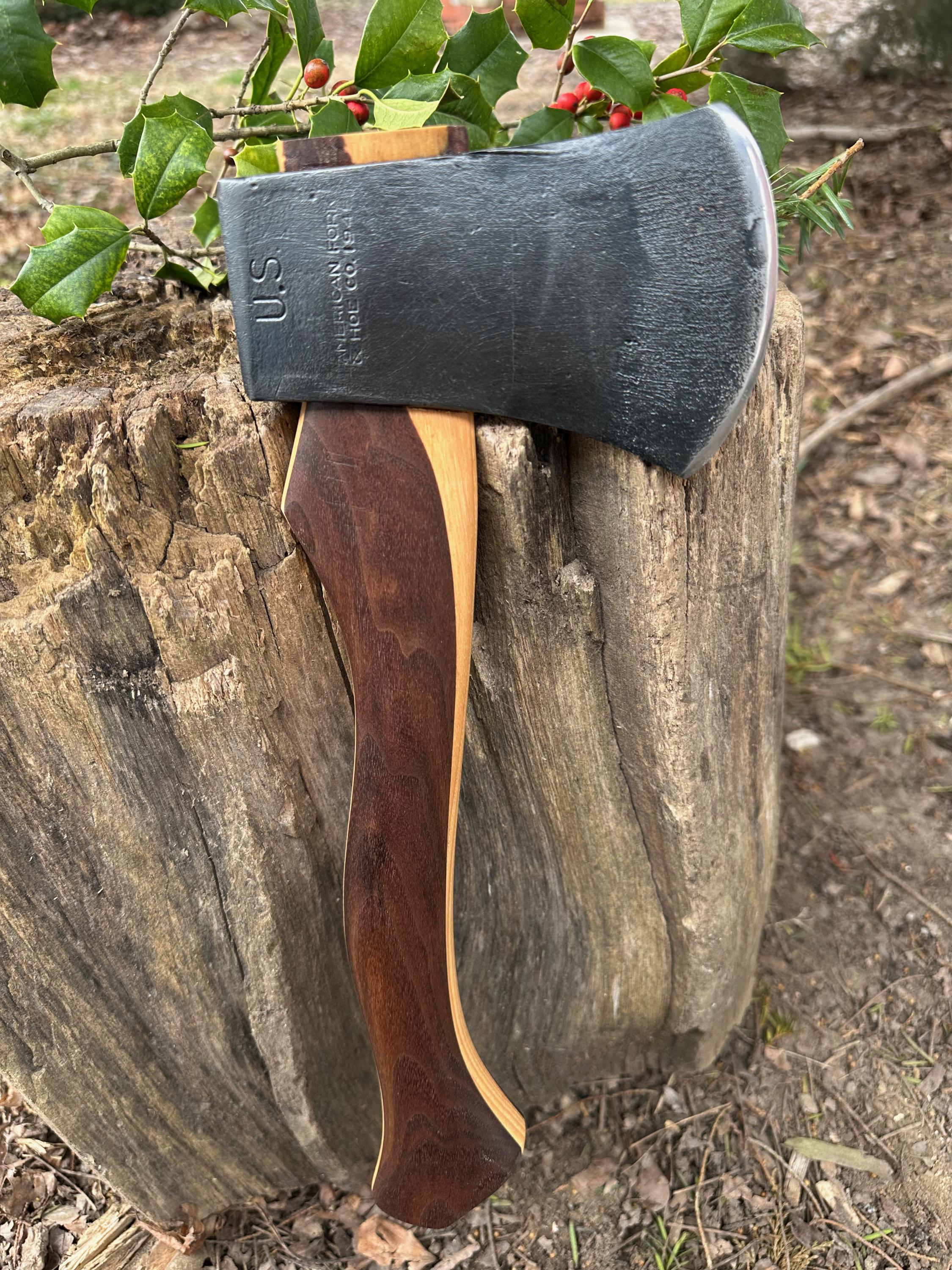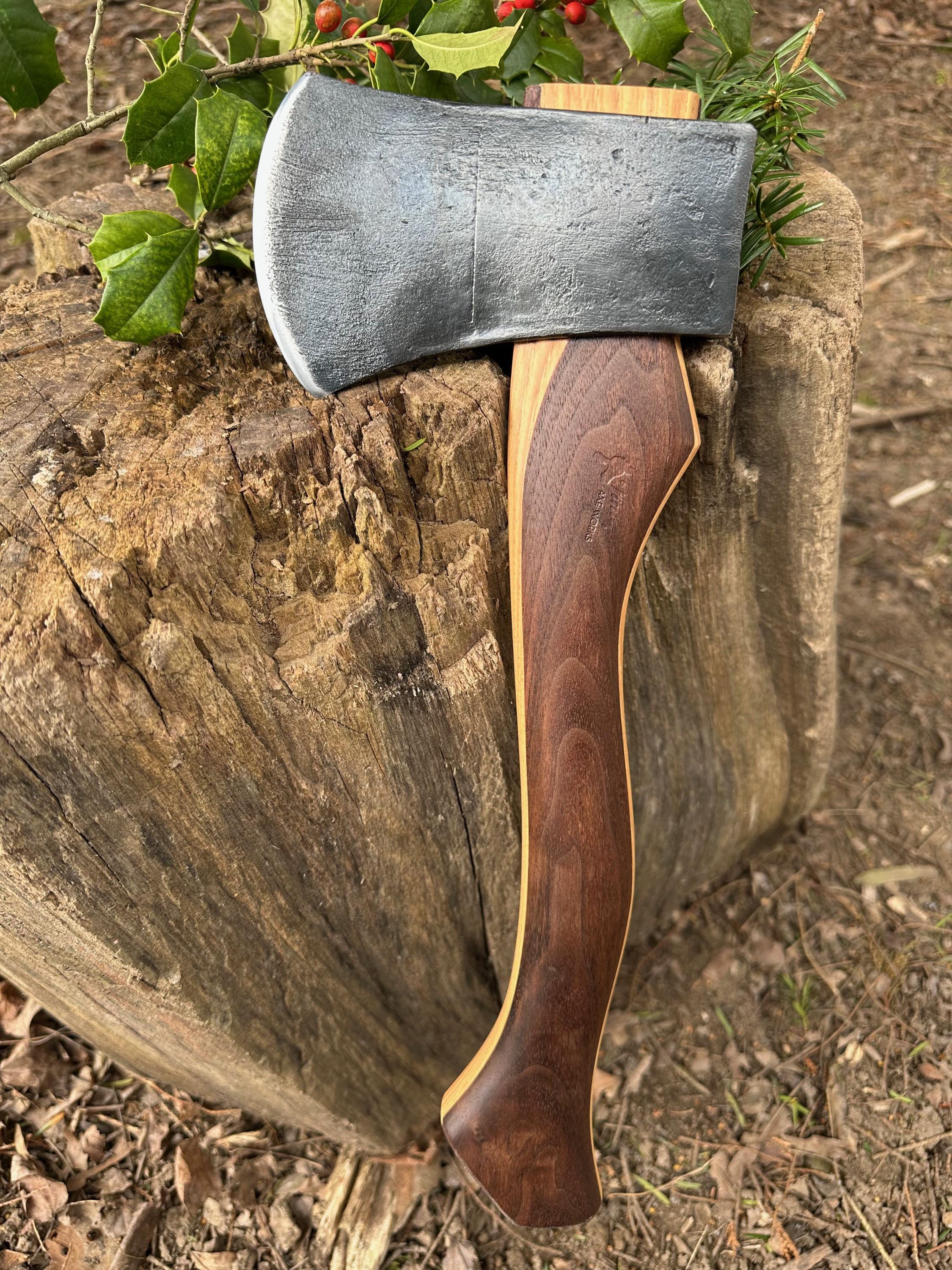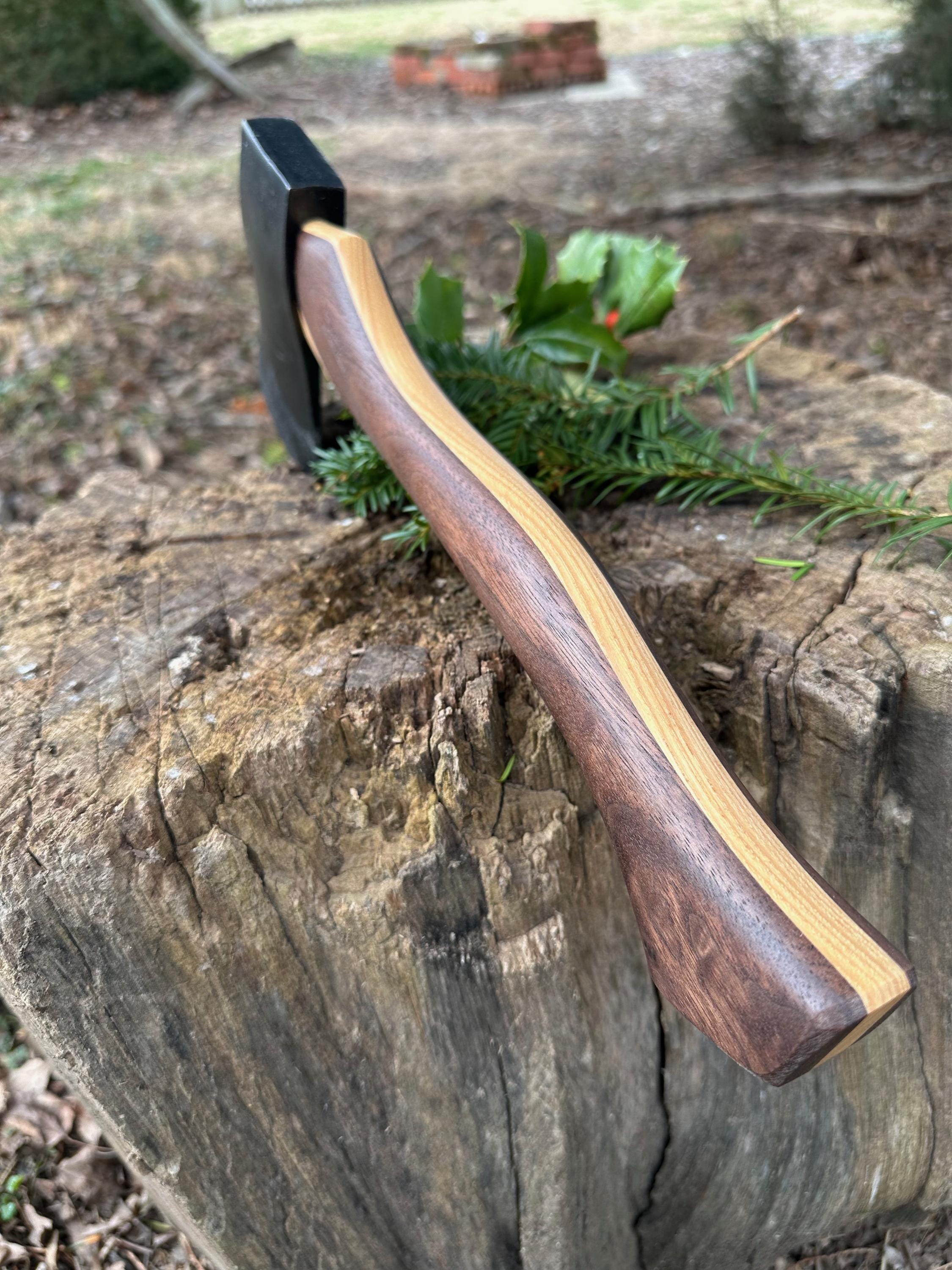 New laminated handle is made of walnut over hickory and has beautiful cathedral grain on both sides’. HAND-SHAPED, hand sanded, soaked in Odie’s Oil and hand-rubbed for a clean, smooth look and feel. Clean seal around top and bottom of eye and hung with a hardwood wedge – handle sticks out from head approximately 3/16”.