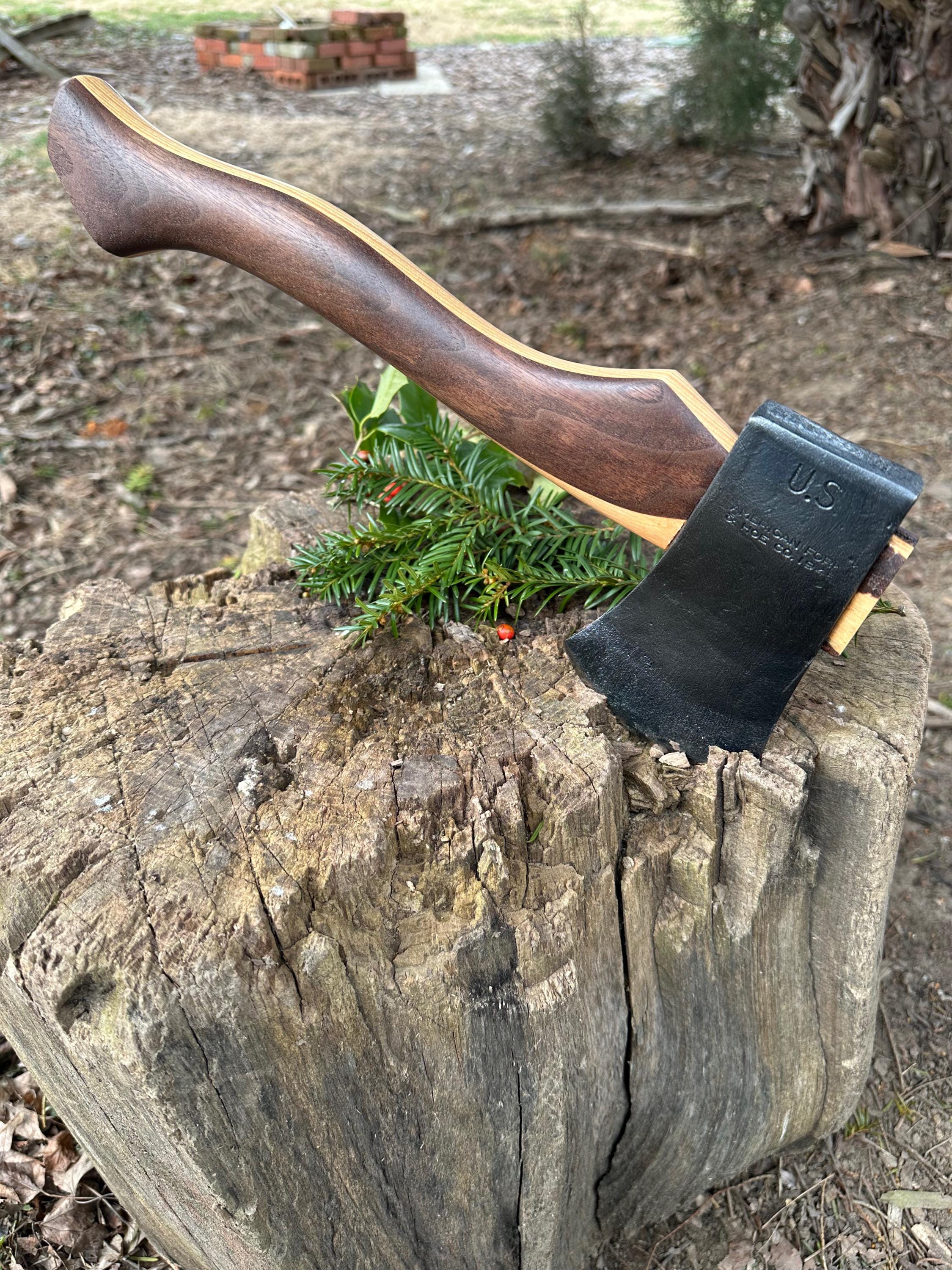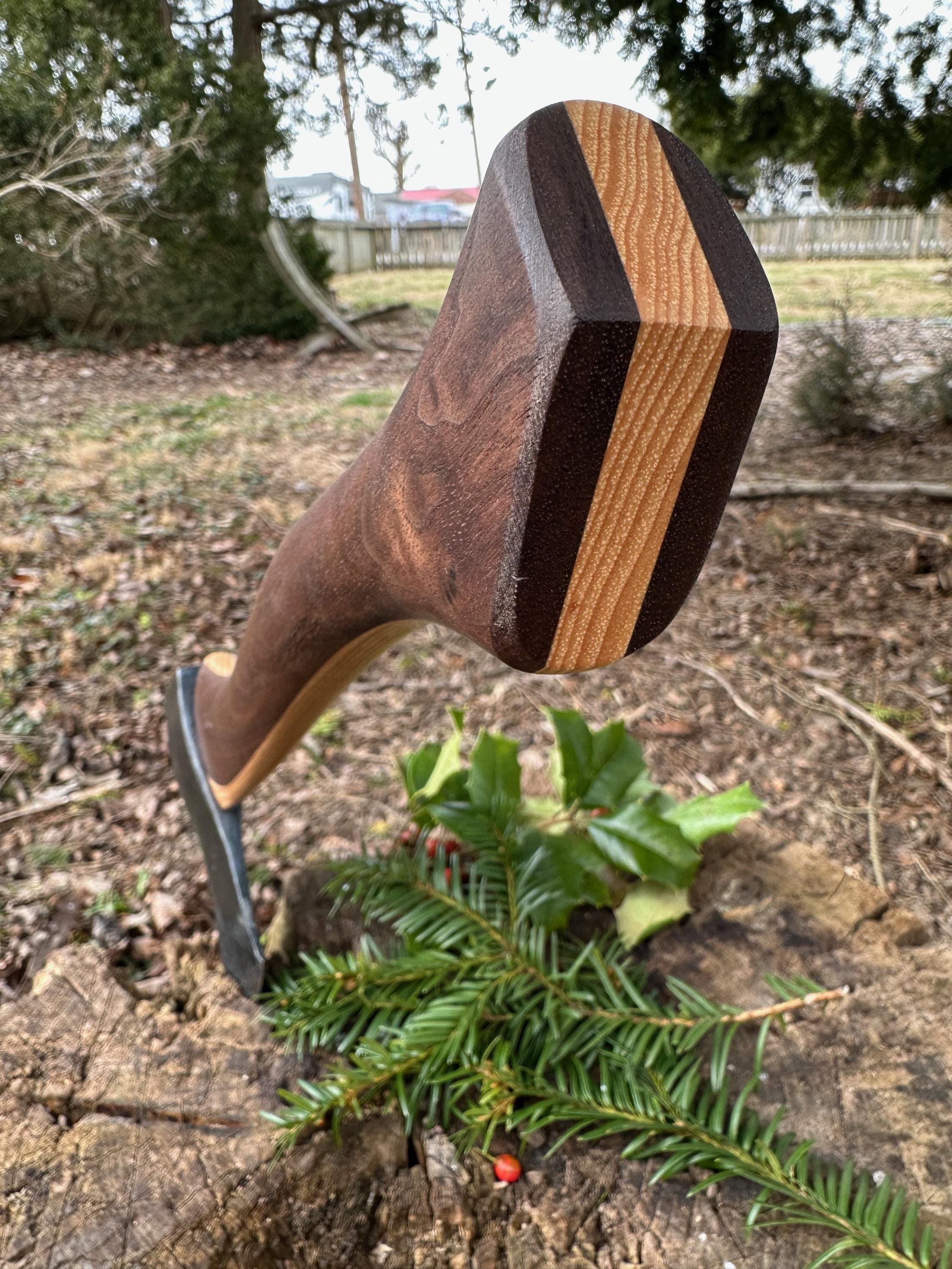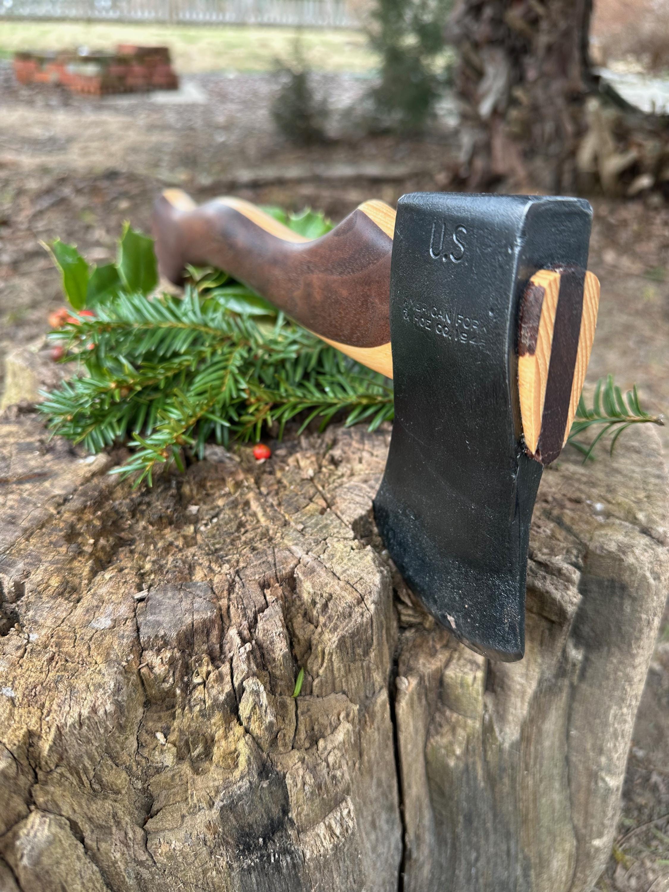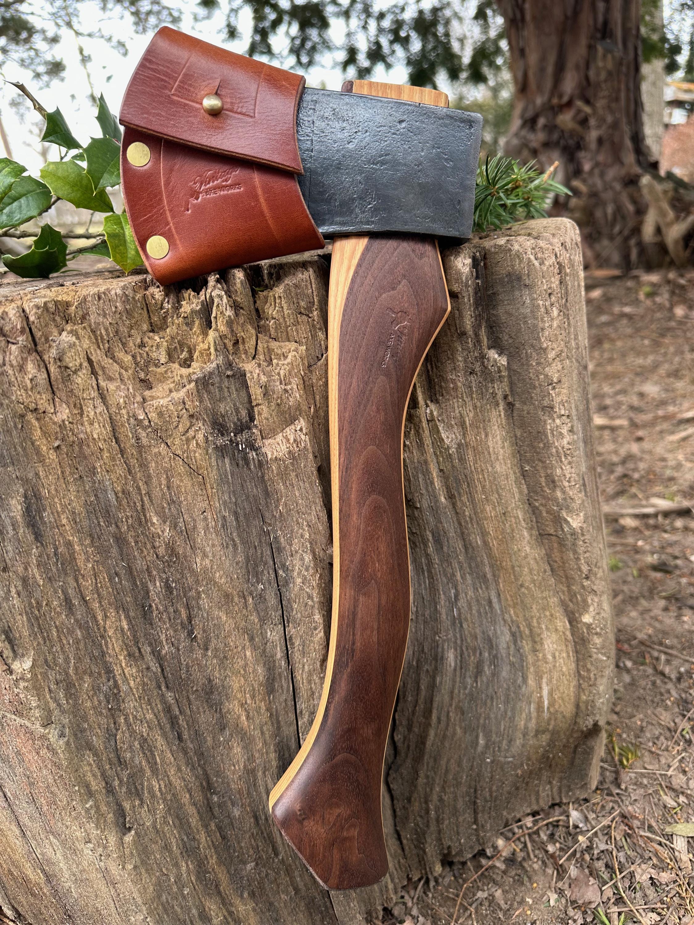 New laminated handle is made of walnut over hickory and has beautiful cathedral grain on both sides’. HAND-SHAPED, hand sanded, soaked in Odie’s Oil and hand-rubbed for a clean, smooth look and feel. Clean seal around top and bottom of eye and hung with a hardwood wedge – handle sticks out from head approximately 3/16”.
