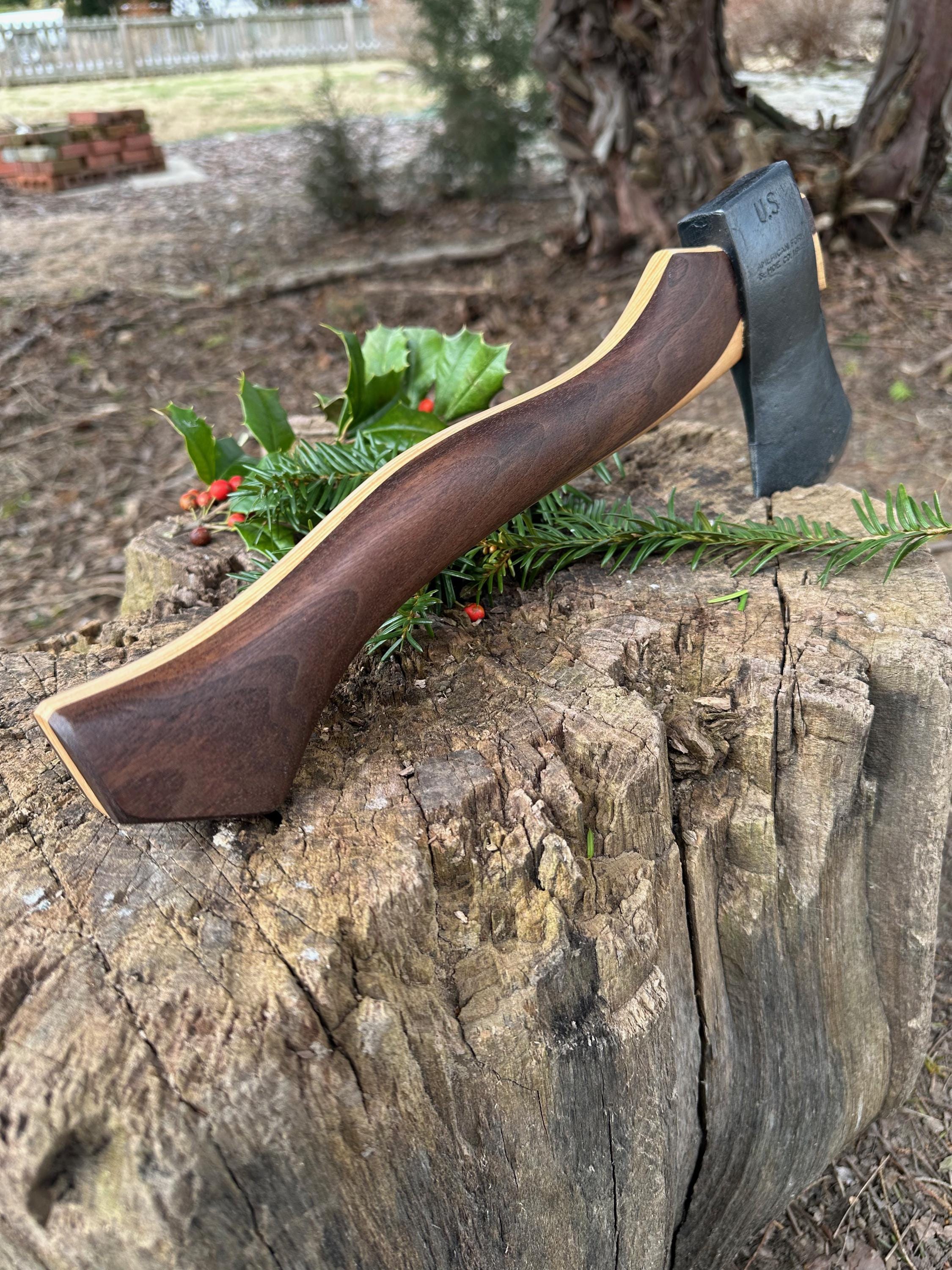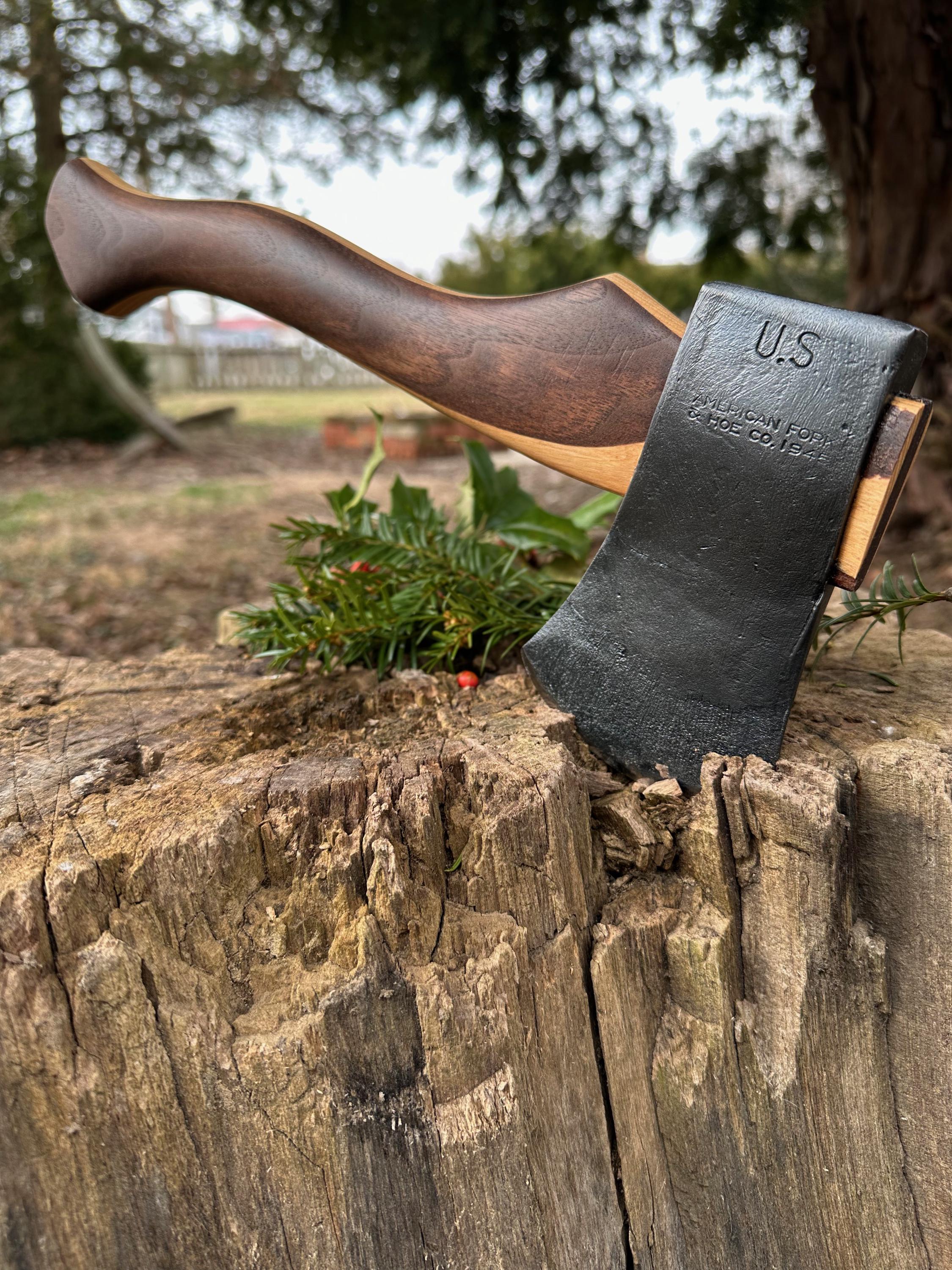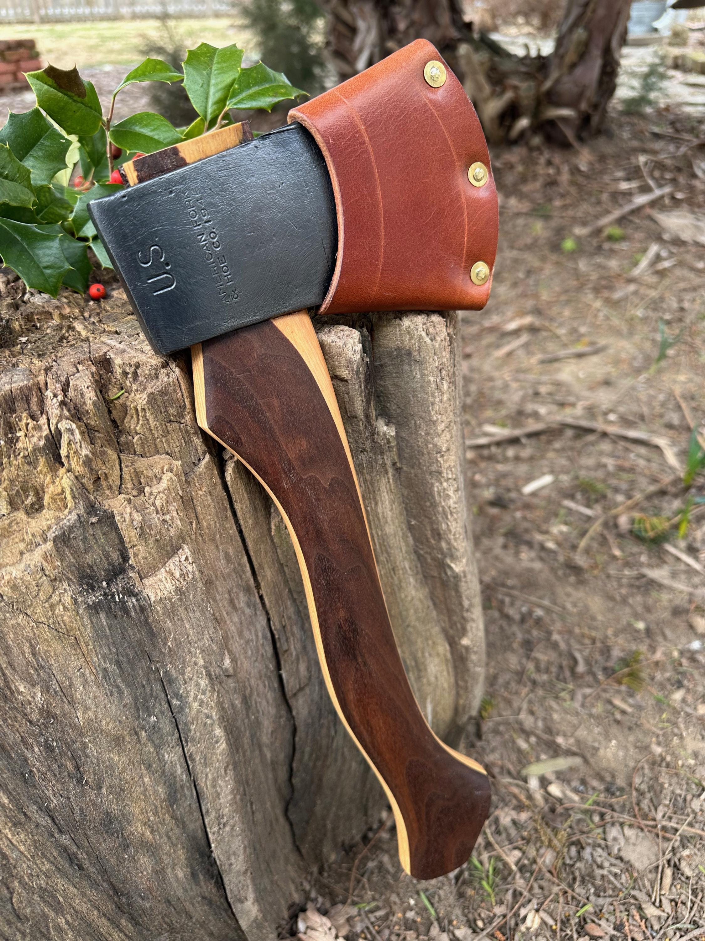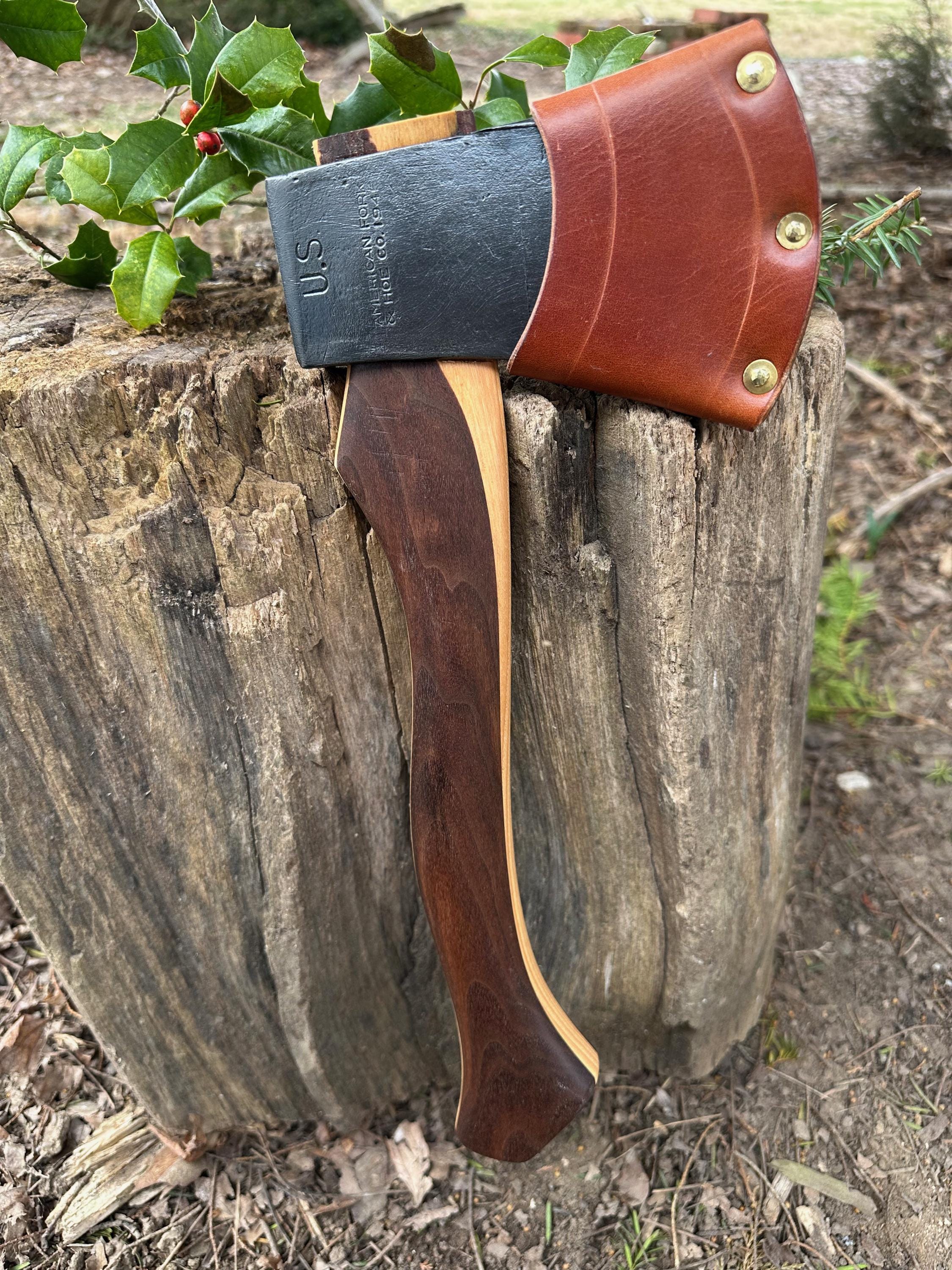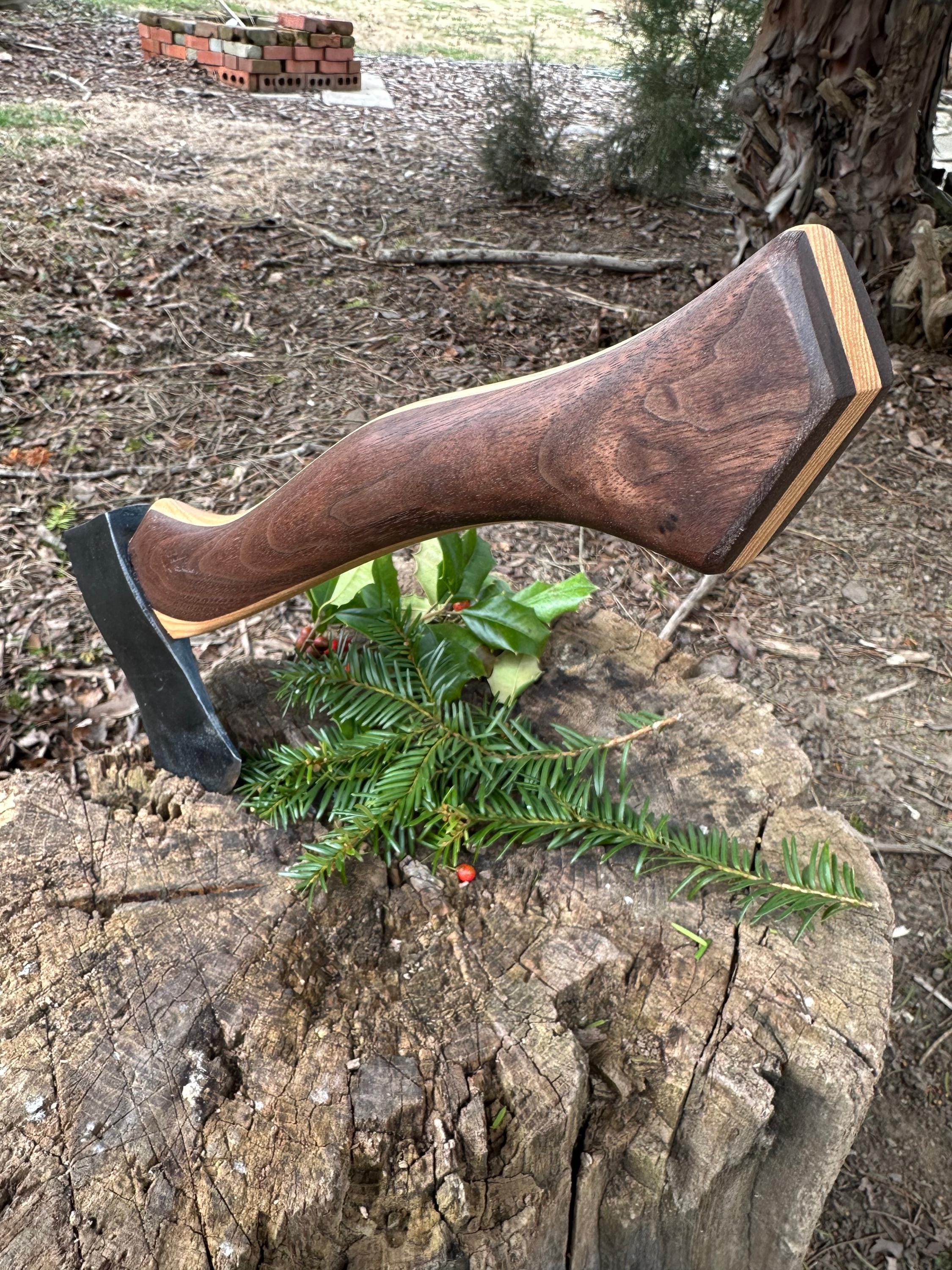 New laminated handle is made of walnut over hickory and has beautiful cathedral grain on both sides’. HAND-SHAPED, hand sanded, soaked in Odie’s Oil and hand-rubbed for a clean, smooth look and feel. Clean seal around top and bottom of eye and hung with a hardwood wedge – handle sticks out from head approximately 3/16”.